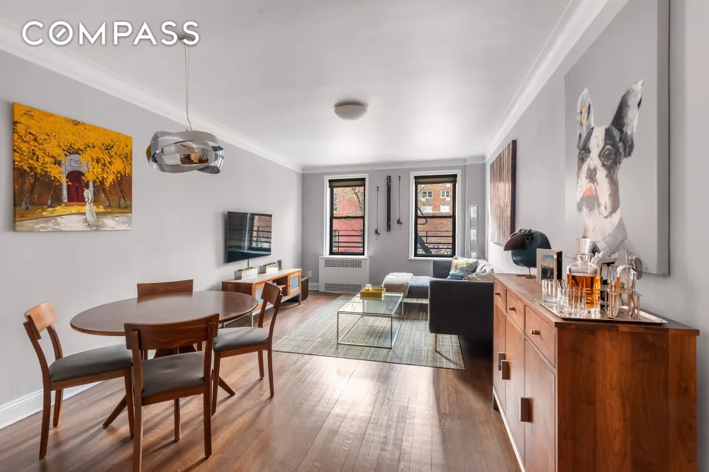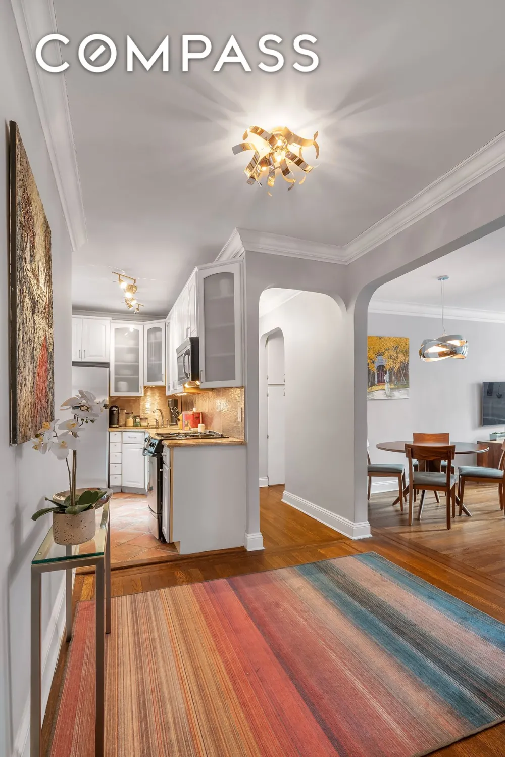 The apartment’s classic architectural details include real hardwood floors, crown molding, and charming archways.