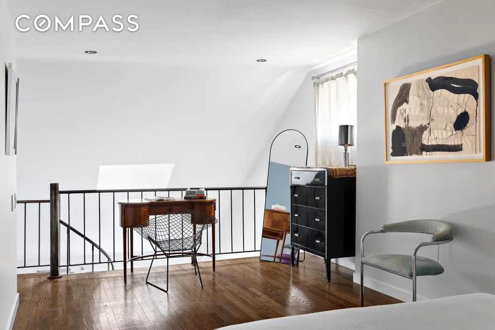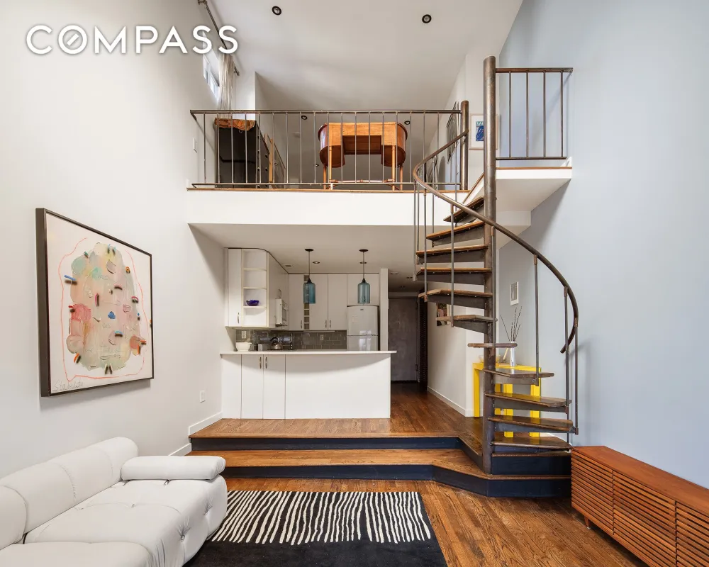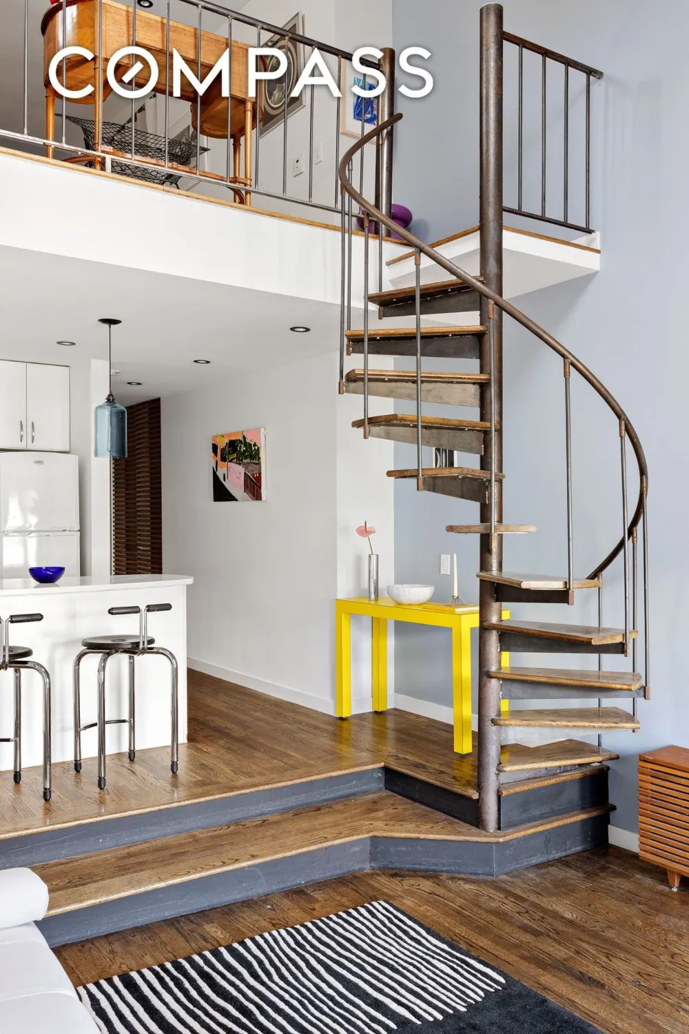 Upon entry, a welcoming glow fills the loft-like space through a skylight in the living room, fostering all day light across both levels. The living area is spacious and flexibly configured, with the added benefit of a private balcony for moments al fresco. There is room enough for living and dining here. The lower level features a generous living area with nearly 17-foot ceilings, an eat-in kitchen, a spiral staircase leading to the sleeping area and a full bathroom. The kitchen is open and well-equipped with ample storage and an island with seating, perfect for entertaining guests or enjoying a private meal. There are beautifully maintained reclaimed dark walnut floors throughout the home, with matching built-ins and closet doors; all wood was thoughtfully reclaimed from Ohio.