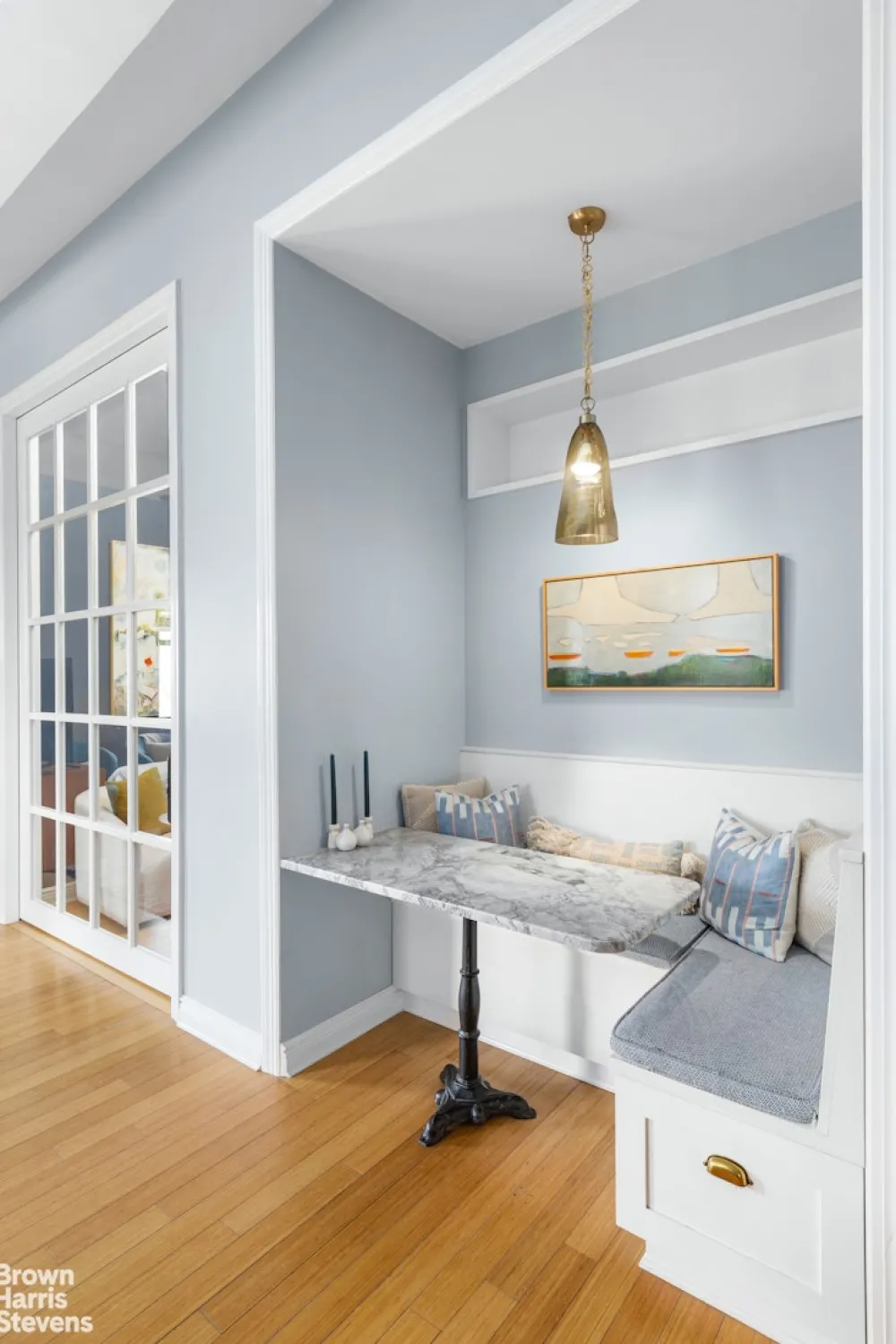 The kitchen has ample counter space for two cooks at the same time as well as an abundance of cabinetry and a hidden pantry. The breakfast dining area was created with beautiful millwork and a marble table.