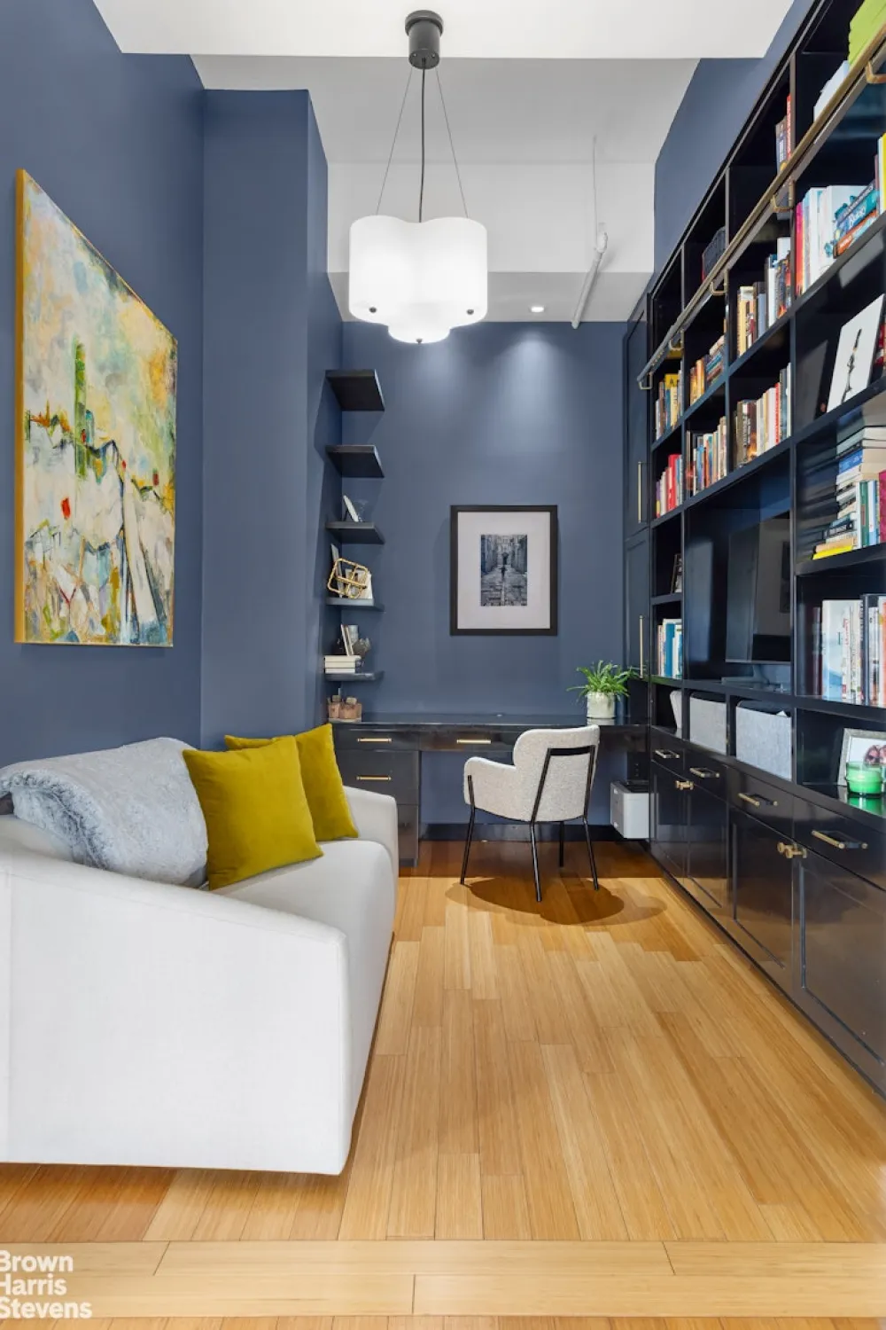 The home office/den, separate from the bedrooms, has a custom glass sliding door for privacy.
