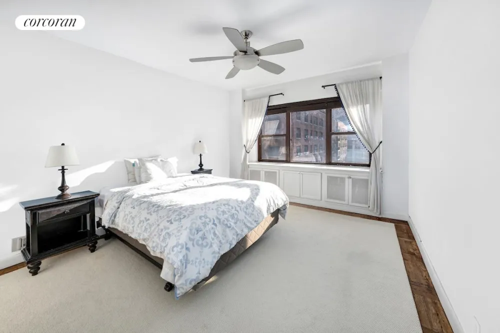 The very spacious bedroom has two good sized closets and overlooks the city with the Chrysler building and Midtown South in the distance.
