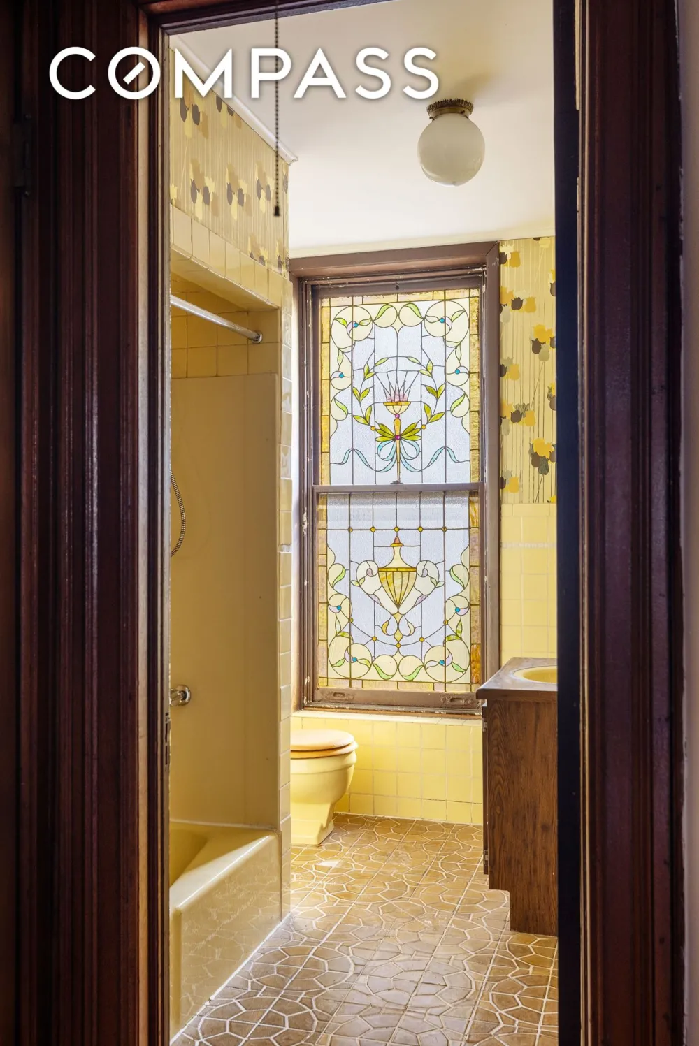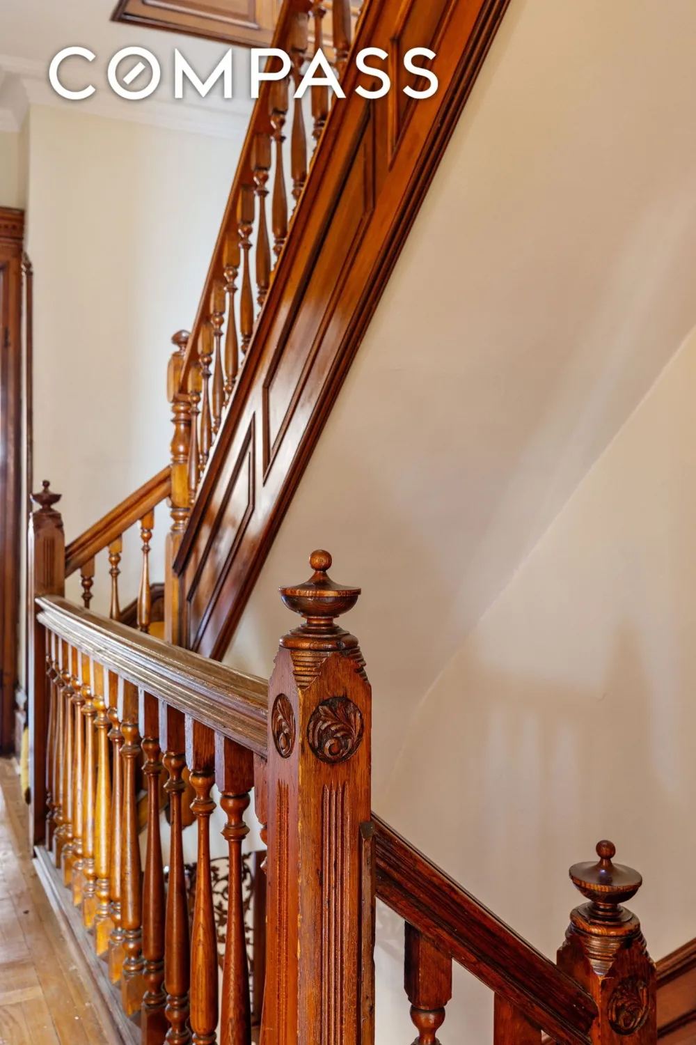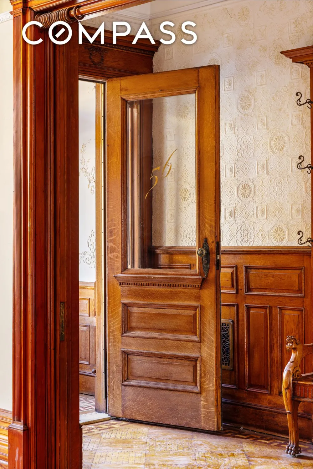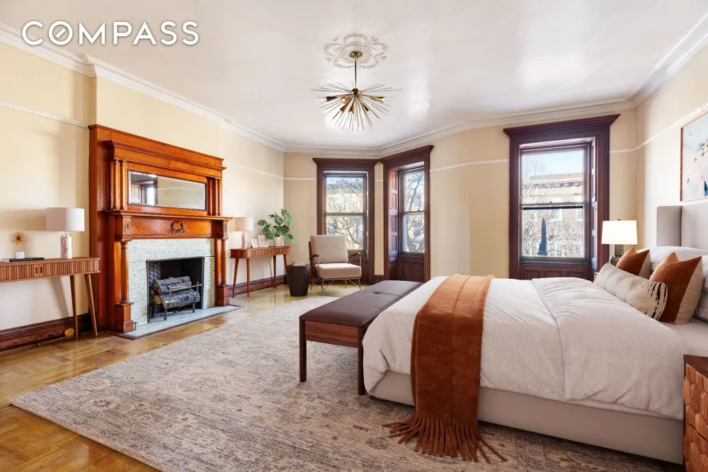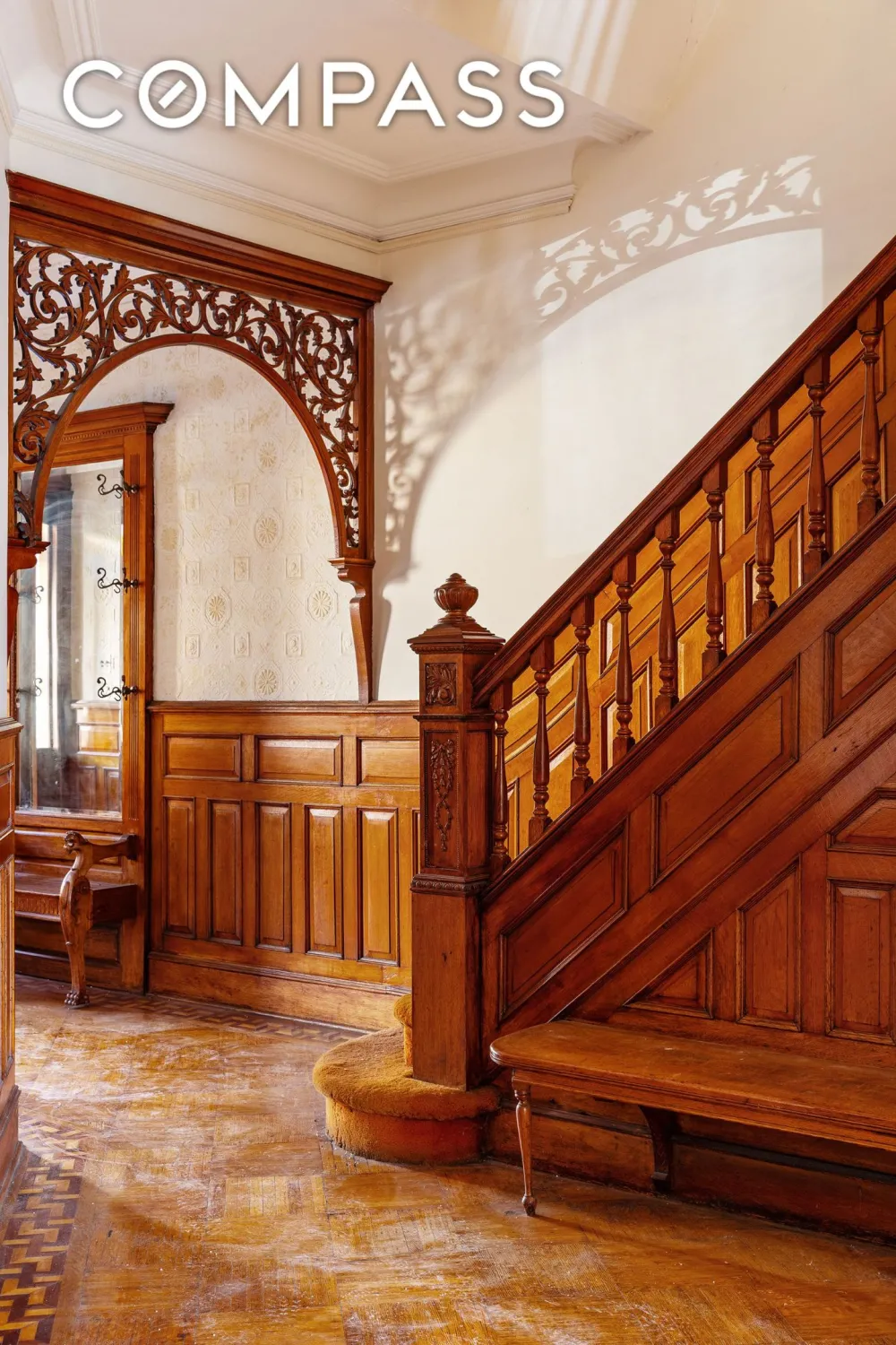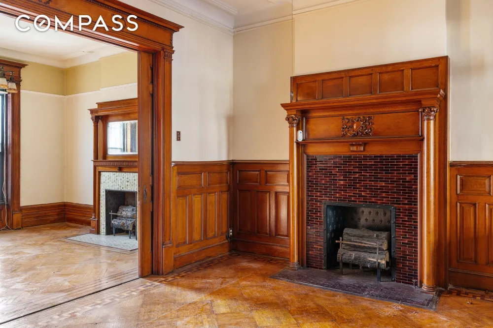 The home’s striking L-shaped stoop leads to an impressive front entrance, highlighted by Romanesque carvings and the original wood-and-glass double doors, which have been beautifully preserved. Inside, the parlor floor welcomes you with elegant pier mirrors, intricate moldings, and original parquet floors. This level features a formal living room at the front, a cozy lounge area with a fireplace in the middle, and a spacious library, also complete with a fireplace.