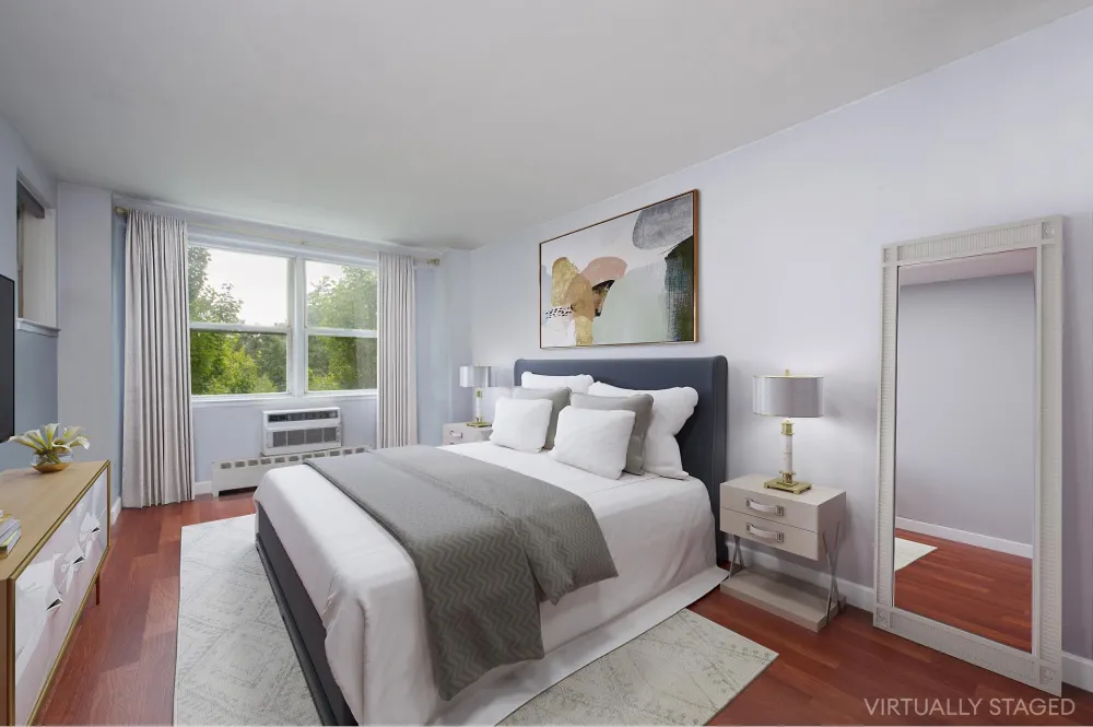 This recently updated one bedroom overlooks the lush grounds of Skyview. The windowed kitchen has been updated featuring stainless steel appliances and quartz countertops. There are Brazilian cherry floors throughout and the north to south exposures provide a beautiful cross breeze throughout the home. Unwind and relax on the south facing balcony and enjoy the colorful sunsets. This is a beautiful, light and airy space that is not to be missed. Washer/Dryer allowed.