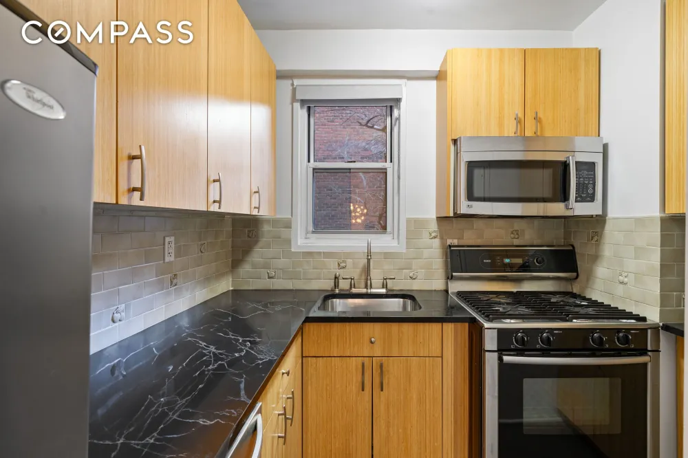 Step inside to a light-filled, open layout where calming garden views create a peaceful retreat from the city buzz. The fully renovated kitchen is a chef’s delight, complete with sleek black granite countertops, chic bamboo cabinetry, a Miele dishwasher, and a Bosch range—perfect for crafting your favorite meals.