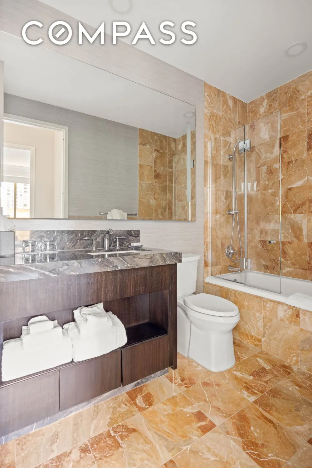 Bathed in the warm glow of western sunlight, expansive views of Broadway unfold before you, creating a captivating backdrop for both work and relaxation. The meticulously designed suite boasts a sleek, stainless steel kitchen, while a dedicated work area provides a refined space for productivity. Indulge in the opulent marble bathroom, a sanctuary of tranquility after a day in the city.