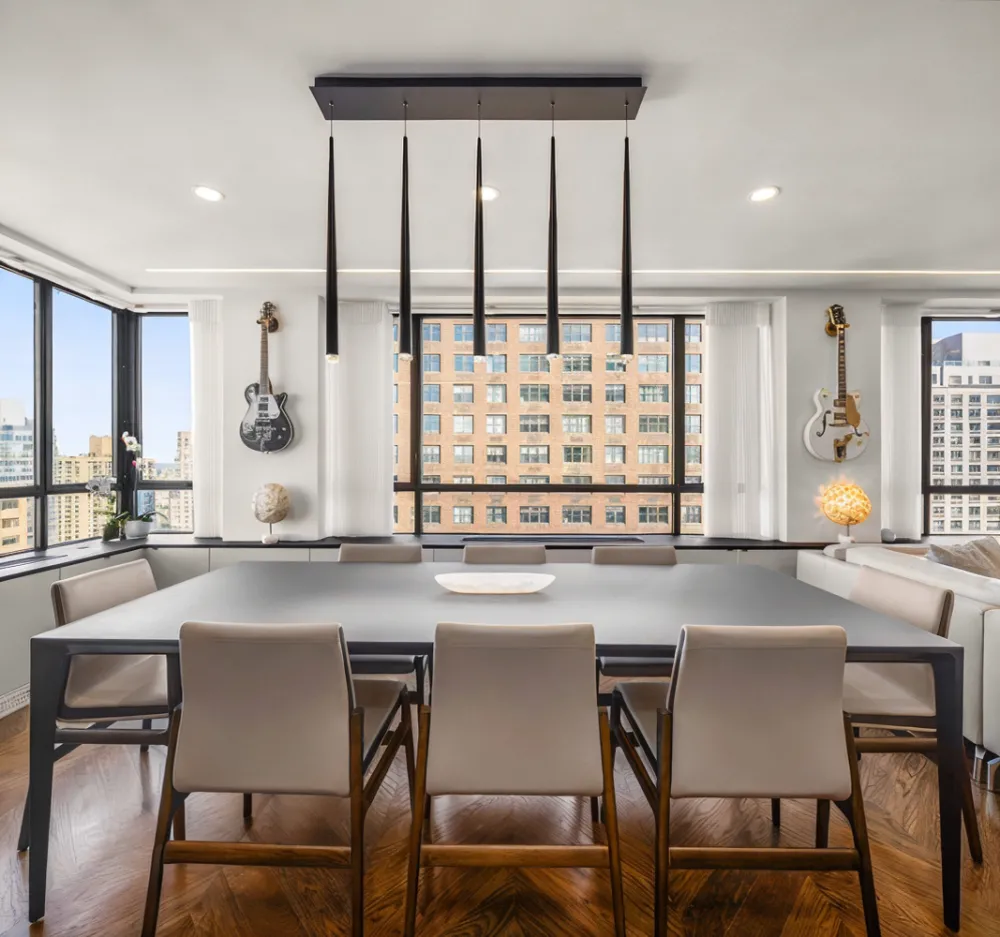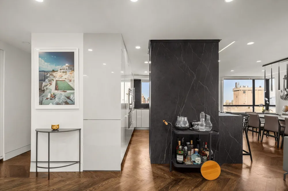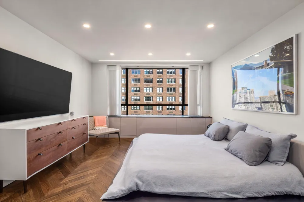 Both bathrooms are renovated with Royal Calcutta Nemo tile, Duravit toilets, wall-mounted vanities, Gessi fixtures, and Robern mirrors. Chevron Oak wood floors and Dekton Laurent radiator tops and windowsills are found throughout the apartment. Apartment 31B has new electrical, plumbing, and water alarm sensors, as well as thermostat, air-controlled cooling and heating. There are tons of custom closets and oversized windows that permit sunlight to stream through this luxurious home.