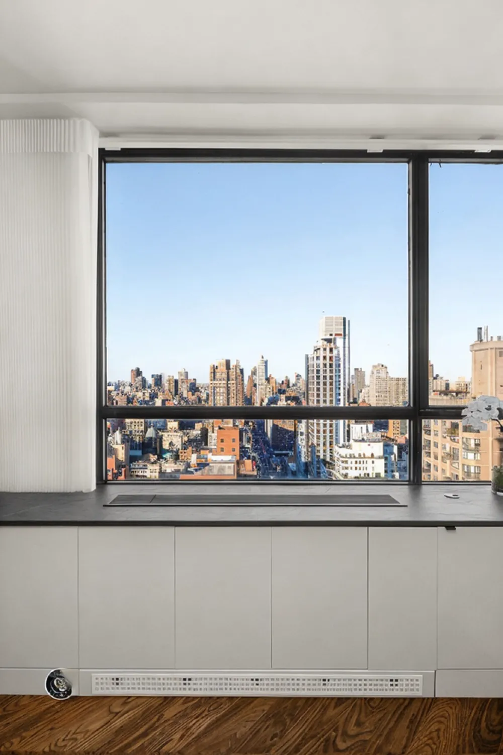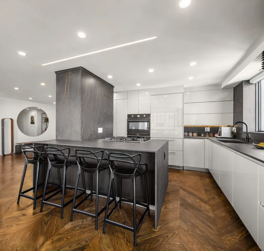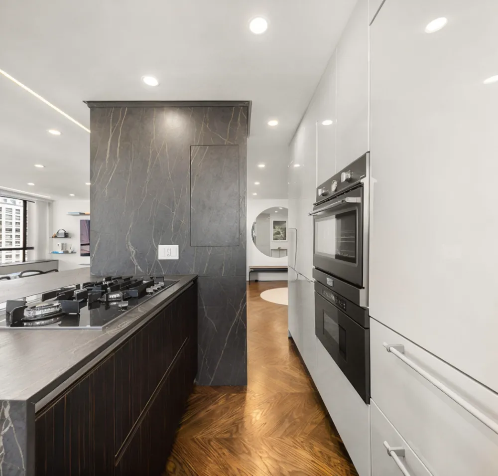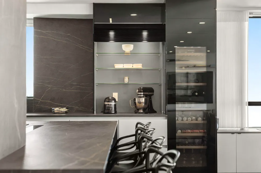 Apartment 31B is east-facing and features a grand 25-foot-wide living room and large dining area, perfect for entertaining guests. The apartment also features an open, windowed kitchen with top-of-the-line appliances and first-class finishes. These include Dekton Laurent 2cm countertops and backsplash, Miele dishwasher and cooktop, Liebherr refrigerator and Faber kitchen hood, Verona wall gas oven, Dacor microwave drawer oven, and custom cabinetry.