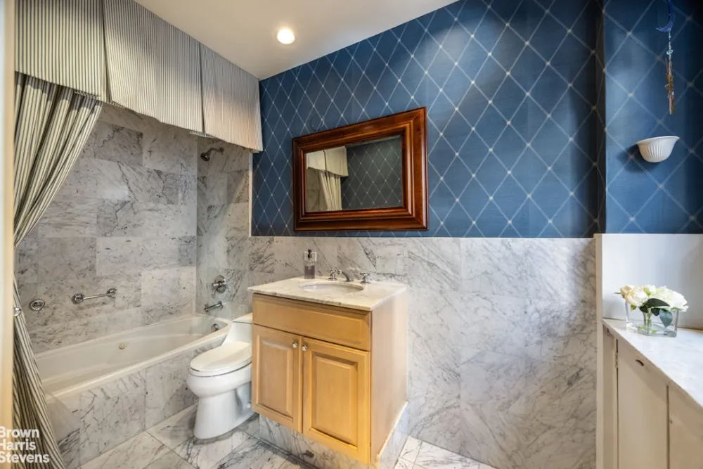 There are three South-facing bedrooms, one of which is located between the living room and primary bedroom and easily used as a library (as it currently is), and two of which are situated off of a dedicated bedroom corridor. The primary bedroom features city windows and has a large walk-in closet supplemented by a wall of custom built-in closeting. The windowed primary bathroom has been newly renovated and is dressed in neutral grey tile with an oversized floating vanity and a glass-enclosed stall shower with a built-in product nook. The primary bathroom is also accessible from the library, providing the library with wonderfully flexible use as both an extension of the primary suite and additional entertaining space. At the westernmost end of the apartment is a second bedroom suite complete with city windows, a large walk-in closet and a marble windowed en-suite bathroom with deep soaking tub.