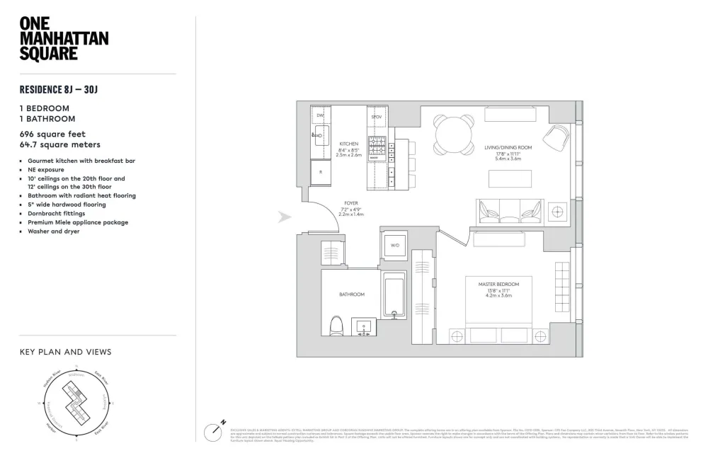 ONE MANHATTAN SQUARE OFFERS ONE OF THE LAST 20-YEAR TAX ABATEMENTS AVAILABLE IN NEW YORK CITY Residence 8J is a 696 square foot one bedroom, one bathroom with an open gourmet kitchen and breakfast bar. This spacious residence faces North East with East River and Williamsburg Bridge views. Warm, modern... See more
