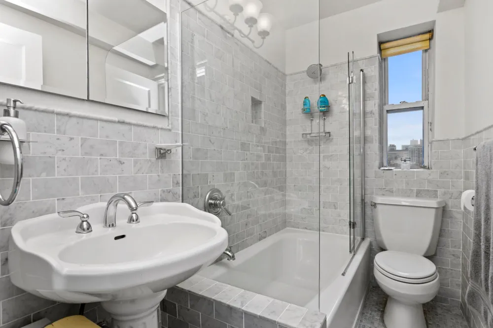 The windowed kitchen has beautiful white cabinetry, some with glass paned doors, gorgeous granite counters, excellent storage, and stainless steel appliances, including a Bosch dishwasher and stove. There is a cozy coffee counter right by the window to perch on a stool and look over the city. The renovated windowed bathroom has Carrera marble and a mosaic tiled floor, Carrera subway tile walls and a glass enclosed tub/shower. The kitchen and bathroom have open northern exposures.