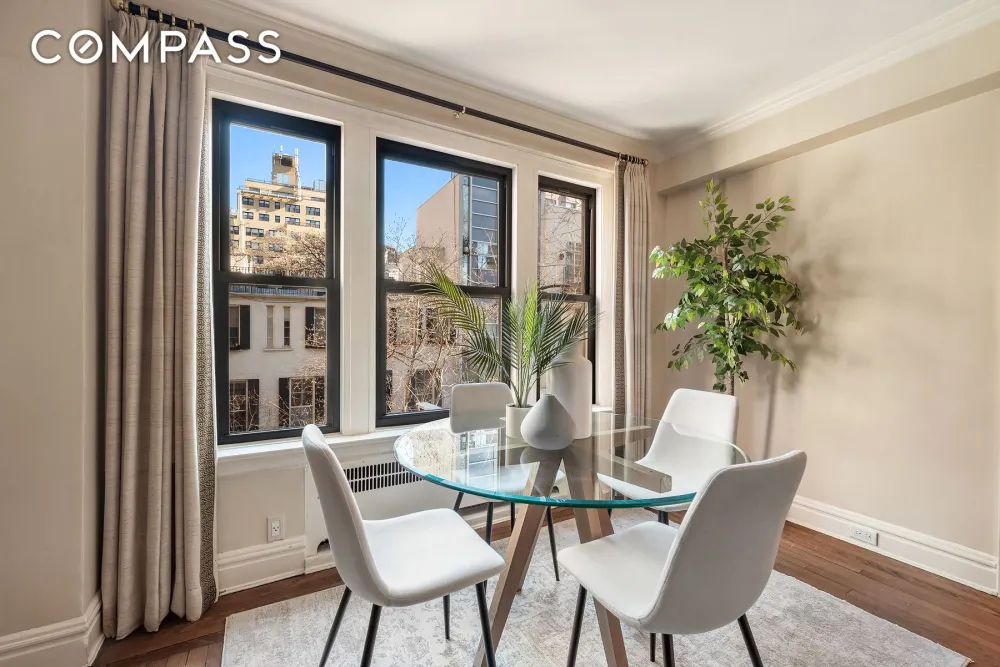 Experience a slice of classic New York elegance and the timeless charm of this renovated one-bedroom apartment. With its gracious layout, beamed ceilings, and seven windows that offer serene views of treetops, open sky, and townhouse gardens, this residence provides an inviting ambiance.