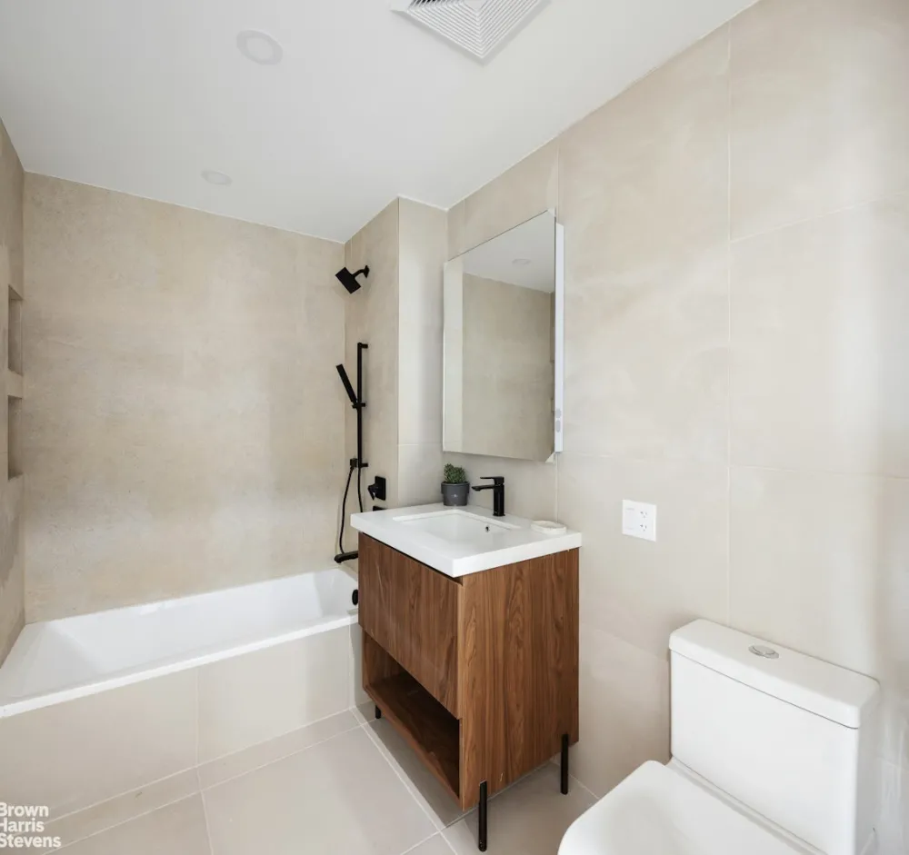 The luxurious bathroom is designed as a private sanctuary, boasting a modern wood double vanity, sleek black Moen fixtures and contemporary lighted mirrors. The spacious bedrooms features large sunny windows Eastern facing windows.