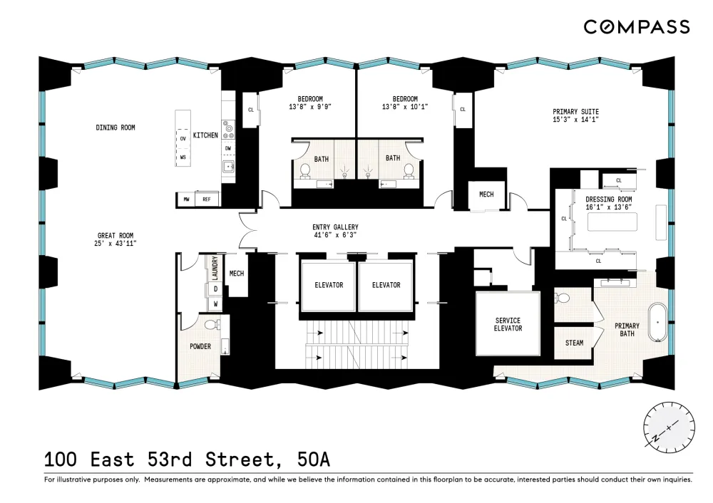 Located at 100 East 53rd Street, Selene offers a refined residential experience crafted by Foster + Partners, with interiors envisioned in collaboration with AD100 designer William T. Georgis. The museum-caliber public spaces, including the Fireside Lobby featuring an installation by renowned artist Rachel Feinstein, add an air of sophistication.