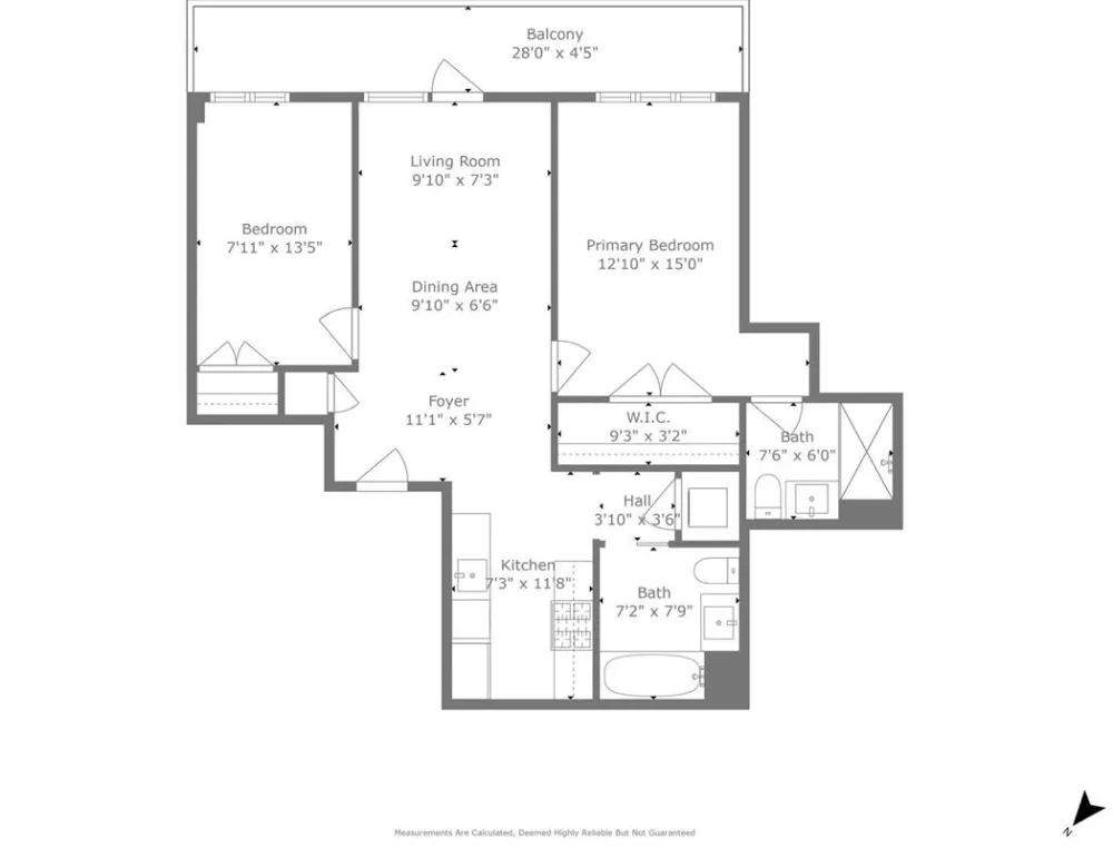 The primary suite comfortably fits a king-size bed and boasts a custom-built storage closet. The second bedroom accommodates a queen-size bed plus a dresser and includes its own custom-built closet. Additional highlights include an in-unit washer/dryer and central heating and cooling for year-round comfort.