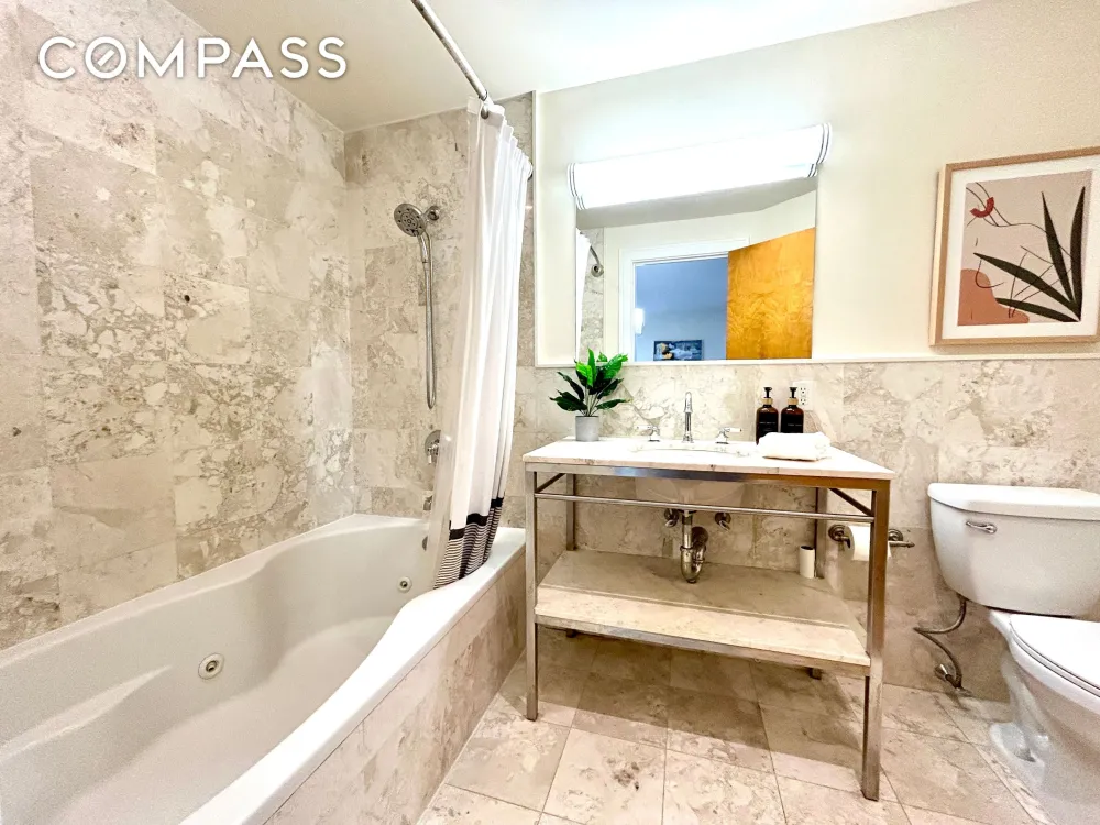 Culinary enthusiasts will appreciate the open kitchen, which boasts new LG stainless steel appliances, granite countertops and backsplash, and solid wood cabinetry. The marble bathrooms are outfitted with Kohler sinks and fixtures and subway tiles.