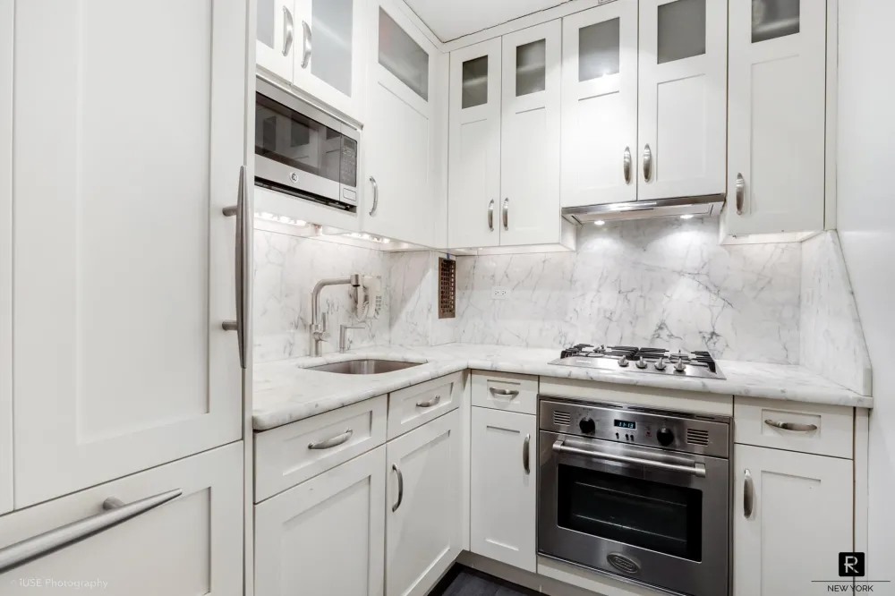 The kitchen is a true chef's delight, featuring a built-in Subzero refrigerator, Miele dishwasher, and Delonghi oven. Marble countertops and custom cabinetry elevate the space, making it a pleasure to prepare meals and entertain guests.