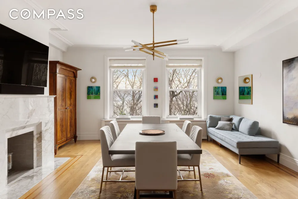 Upon entering, a gracious foyer sets the tone for the residence’s grand proportions and refined details. The expansive living and dining area is a showstopper, boasting stunning west-facing views of Riverside Park and the Hudson River, intricate wood flooring with an elegant inlay pattern, and a marble-clad fireplace hearth that adds warmth and sophistication.