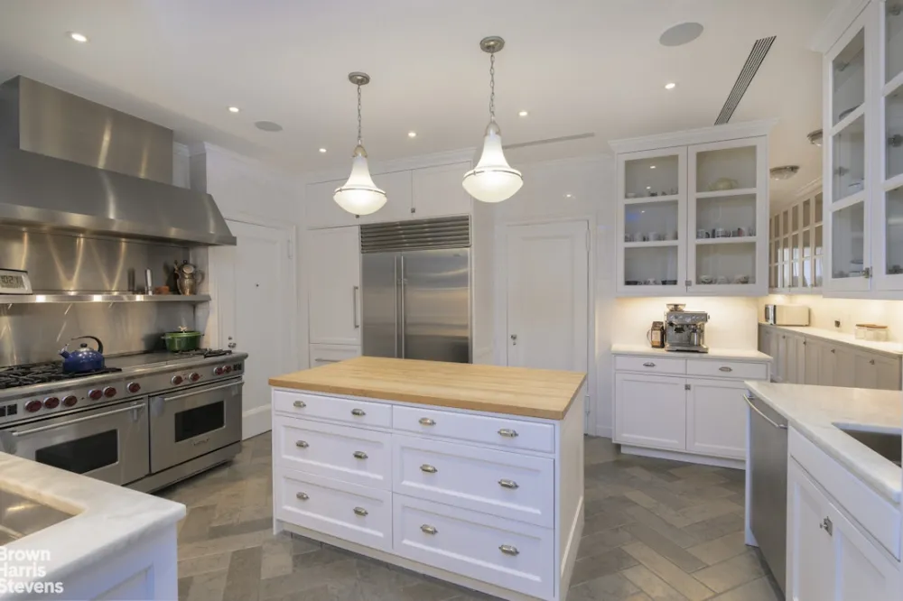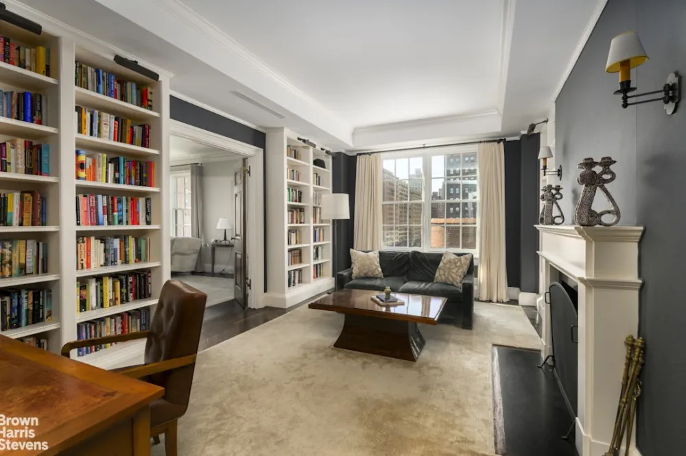 Stunning, elegant south-facing Rosario Candela 12-room classic in lovely renovated condition. Architecturally updated for today's living, with restored original details including six-panel solid mahogany doors, brass olive hinge hardware, herringbone floors, and plaster moldings. The grand entrance gallery forms an impressive fulcrum from which all the public rooms are accessed. A massive corner living room faces south and east onto leafy Park Avenue, with lovely sunlight, grand proportions, and a wood-burning fireplace. A gracious paneled dining room also faces east onto Park Avenue. Adjoining the living room through mahogany French doors, the sunny library and has custom millwork and a second marble wood-burning fireplace. A private hallway provides privacy from the public rooms and leads to four large bedrooms with marble baths and fittings by Waterworks. A large media room could easily be a fifth bedroom, and has another Waterworks private bath. There is an excellent laundry room with ample storage, and a vented Miele washer dryer. The dream kitchen features a center island with butcher block counters, custom glass-fronted cabinetry, white marble counters, a 48-inch vented Viking range and two Sub-zero refrigerators. A windowed breakfast area has built-in banquette seating, and enormous pantry with a temperature controlled wine room leads back into the formal dining room. The apartment also has zoned central air conditioning, a sound system throughout, and six over six Pella architect series windows. Serenely and traditionally decorated, this apartment is an oasis in one of Carnegie Hill's best Rosario Candela buildings. 1220 Park Avenue is a full service cooperative with a gym, private storage, bike room, and a live-in resident manager. 50% financing is permitted and pets are welcome.