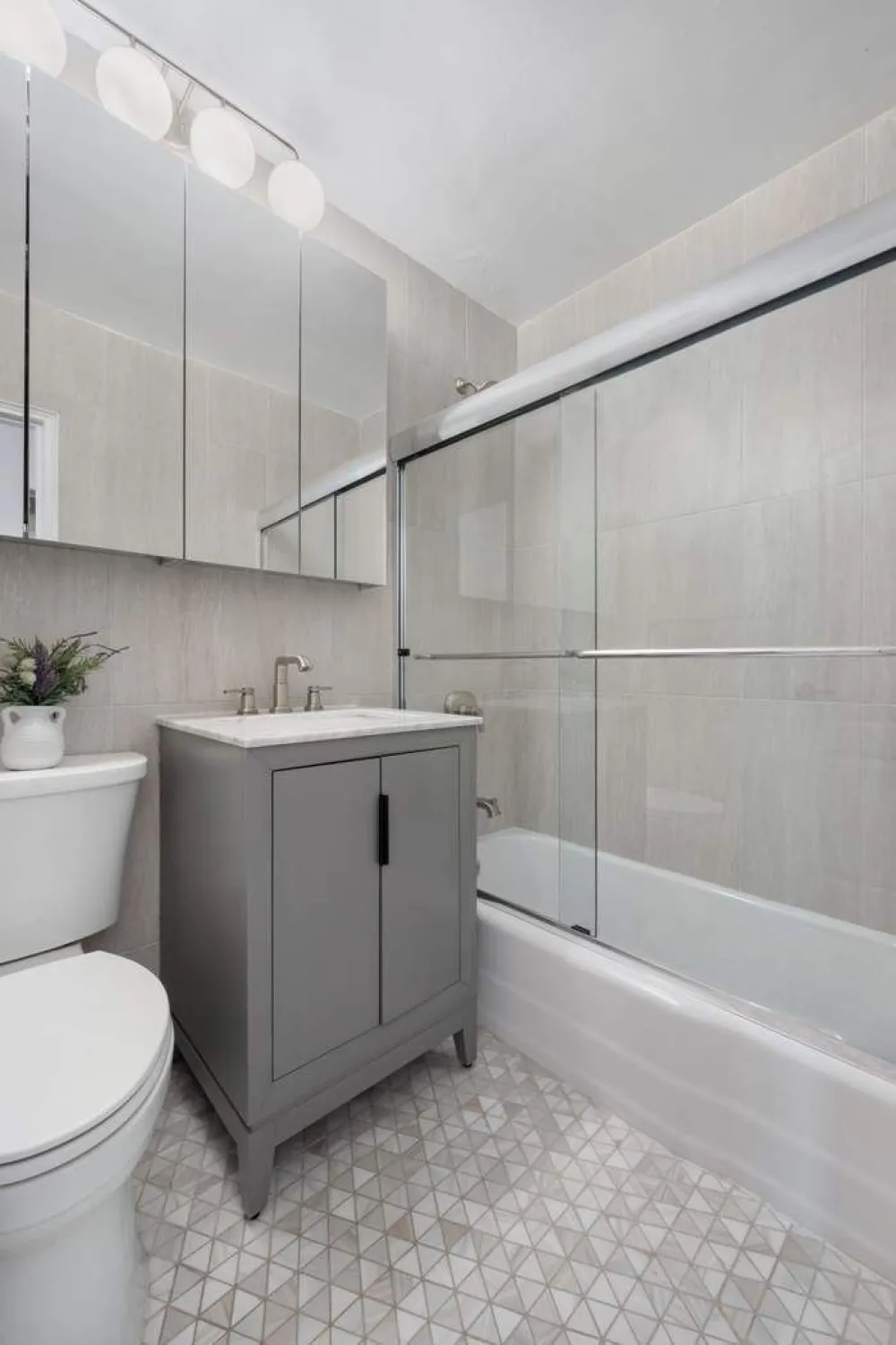 The bathroom was beautifully renovated last year with chic mosaic flooring, large slab marble tiles with a glass enclosed shower over tub.
