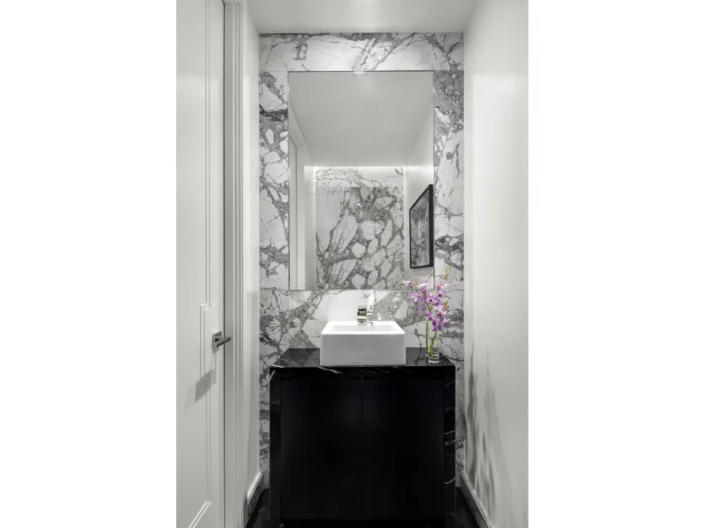 The primary bedroom features an expansive walk-in closet and en-suite five fixture primary bath. The serene primary bath offers Bianco Dolomiti radiant heated flooring underfoot, an enclosed shower, and a separate Kohler tub with Marno Illusion marble details. A custom vanity with white oak, rift-cut wood veneer millwork, and Marno Illusion countertops is completed with a built-in medicine cabinet, Kallista Sink and Dornbracht Fixtures. A unique powder room features a dramatically veined Nero Maquina vanity countertop, ebony stained oak quarter cut wood veneer vanity and Nero Maquina floors. An eye-catching Cobalt Flash marble wet wall, Dornbracht fixtures and a Kohler Corbelle toilet offers a striking contrast against the dark woods and stones. A Nest Learning Thermostat and Bosch washer and dryer complete this elegant residence.