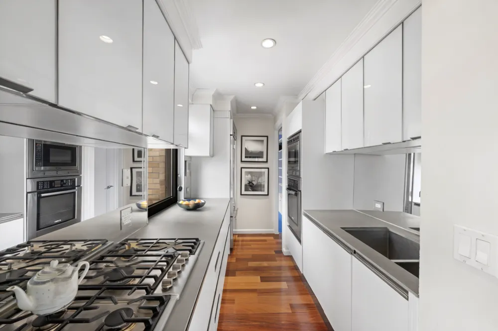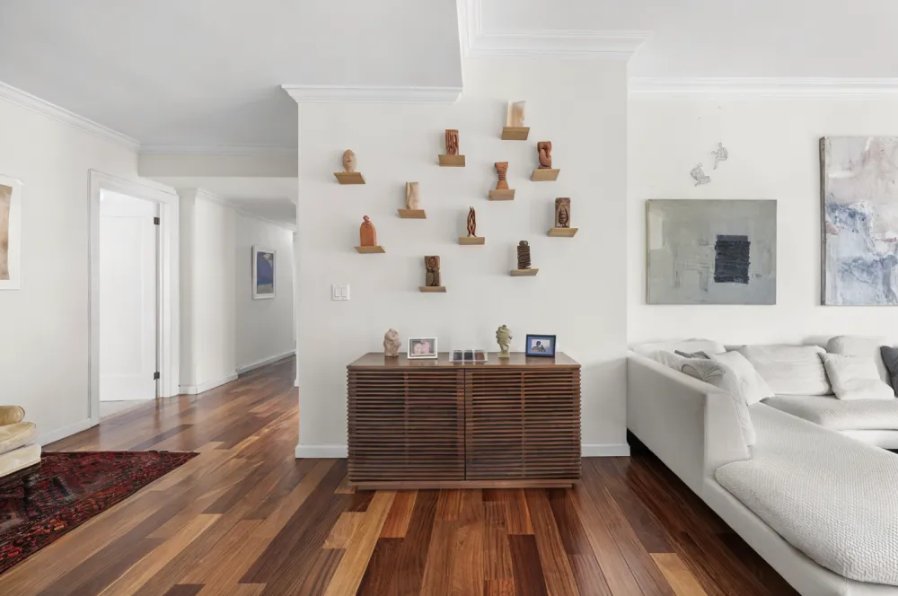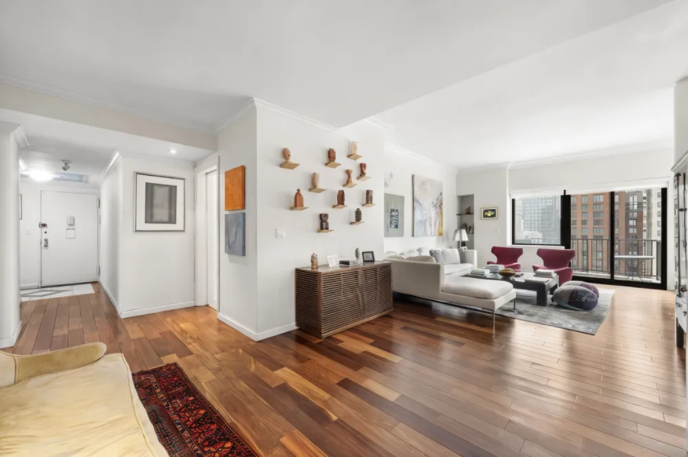 The unique 30x13 foot living room boasts 10-foot ceilings, creating an airy, loft-like ambiance. The south-facing exposure and balcony enhance the light-filled space, complemented by Brazilian teak flooring and soundproofing throughout. Of the entire building, only the 27thfloor boasts these impressive ceiling heights.