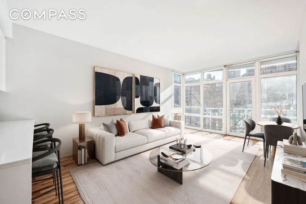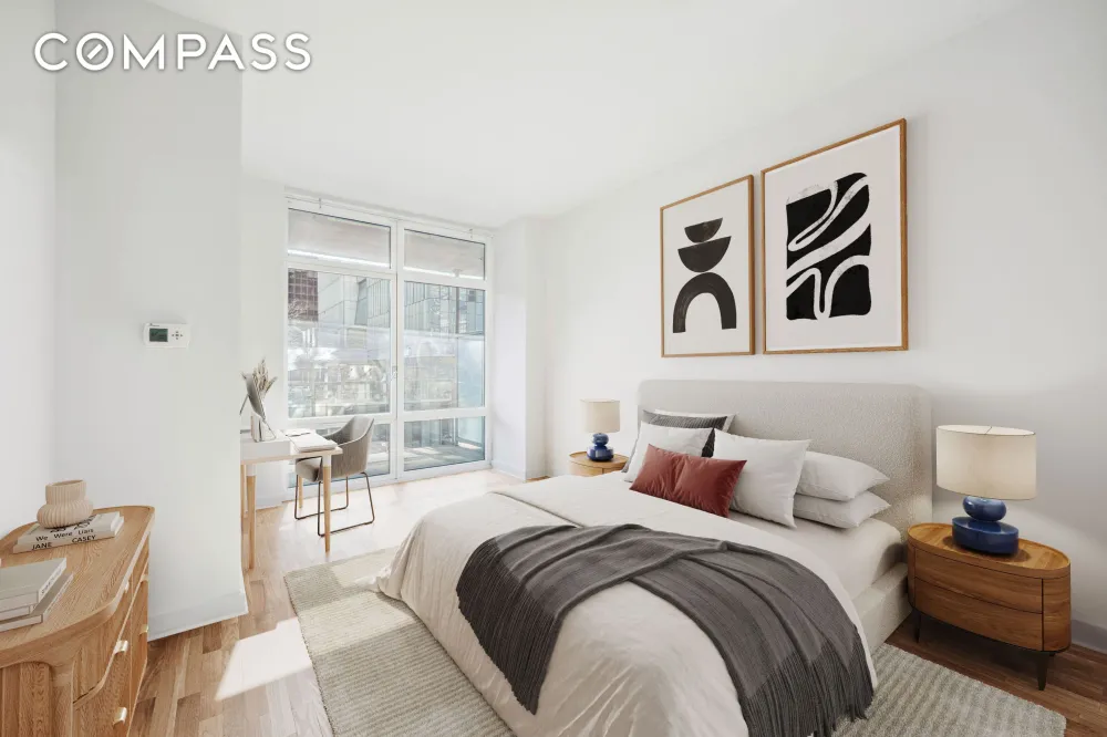 Welcome to Residence 7E, a stunning home bathed in natural light from its southern exposure. This bright and spacious unit boasts soaring 9.5-foot ceilings and floor-to-ceiling windows, seamlessly connecting you to the city skyline. The open-concept layout is enhanced by beautiful oak hardwood floors...			See more