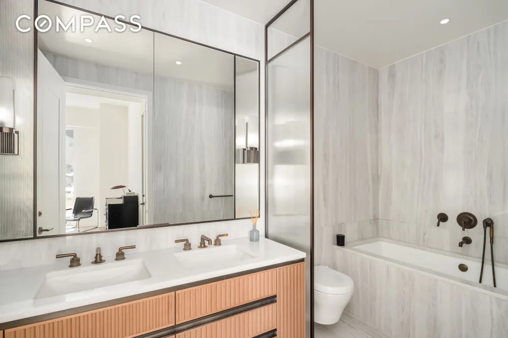 Beyond the great room, you'll find the airy, light-filled primary bedroom, complete with a massive custom walk-in closet and ensuite bath. The spa-like ensuite features large slabbed Nestos Beige Marble radiant-heated floors, a custom vanity with polished Emperador Grey marble countertops, a built-in mirror, and a medicine cabinet framed in custom-designed bronze-finished metal. Specialty glass wall sconces and fluted mirror panels add to the elegance. The secondary bath is just as luxurious, showcasing Cristallo Pearl honed marble flooring, polished marble wet walls, and custom vanities with Cristallo Pearl counters and oak cabinetry. With a washer/dryer, ample closets, high ceilings, and wide-plank oak floors, this home embodies downtown living at its finest.