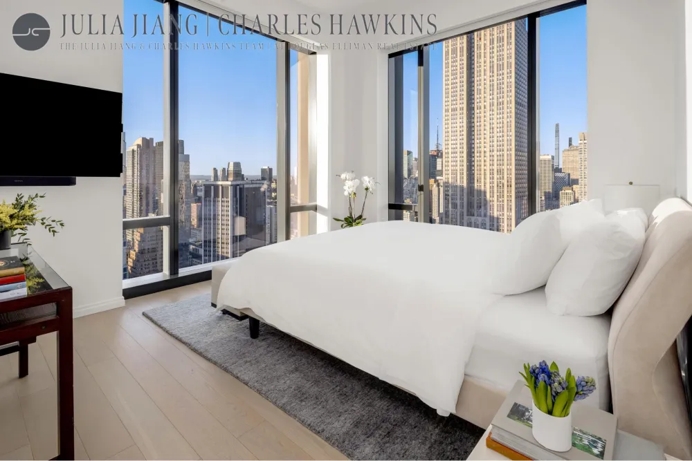 The primary suite, a private corner retreat with North and West exposures, presents unparalleled views of the Empire State Building, a feature exclusive to only a handful of residences in the building. A massive custom walk-in closet provides extraordinary storage, while the windowed primary bathroom is a rare indulgence, featuring radiant heated marble floors, dual walnut vanities flanking a freestanding soaking tub, and a glass-enclosed walk-in shower with both rain and handheld showerheads, this serene space is bathed in natural light and impeccable design.