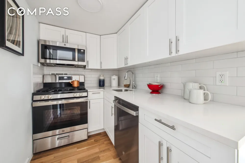 The expansive living and dining area feature South Western exposures. The fully renovated kitchen features quartzite counters and subway tiles, along with a top-of-the-line appliance stainless steel package.