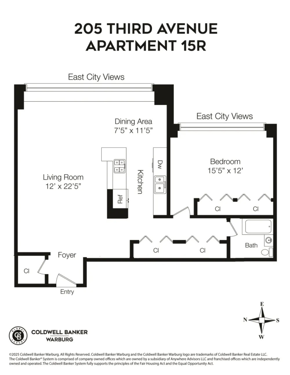 Over-sized, sunny one bedroom, one bathroom with incredible city views. Residence 15R is very large (approximately 900 square feet) and has a flexible space perfect for a dining room, home office or an additional bedroom. This expansive layout currently features a living room, large dining area (easily convertible) a windowed kitchen, a king-sized bedroom with room for a seating area or office and multiple walk in closets. Sun filled eastern exposures with open city views bathe the entire apartment in light.