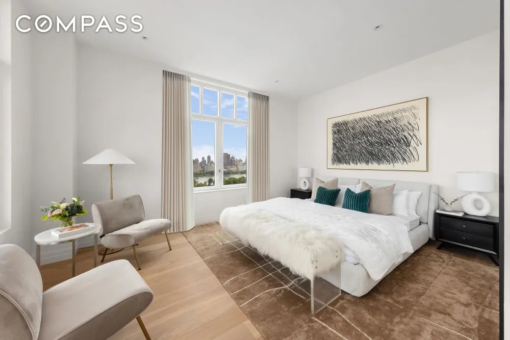 The grand primary suite offers a formal entry, a generous sitting area, and two spacious walk-in closets. Its serene 82 SF private terrace serves as a personal retreat overlooking Central Park. The en-suite bathroom is a spa-like sanctuary, complete with radiant heated flooring, large-format Calacatta Gold slabs, a luxurious soaking tub with Grohe fittings, and a striking Rose Aurora marble slab atop a custom walnut Bilotta vanity.