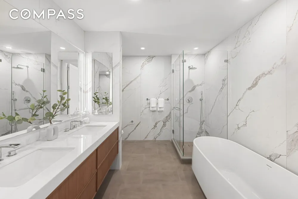 The exceptional primary bedroom suite features a private 71-square-foot balcony, an expansive walk-in closet, and a spa-like, five-fixture ensuite bathroom. Thoughtfully designed, it includes radiant heated flooring, large-format Calacatta Gold slabs, a luxurious soaking tub with Grohe bath accessories, and a stunning Rose Aurora marble slab topping the custom walnut Bilotta vanity.