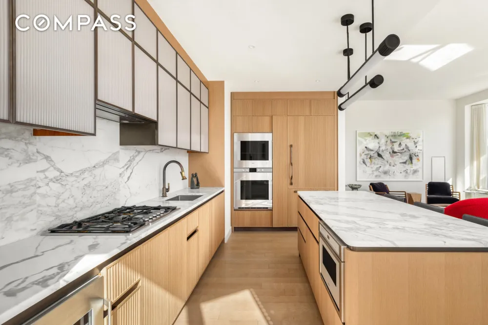 Residence 1102 is a grand two-bedroom, 2.5 bath home that offers south and east exposures with open city views. The gracious foyer and oversized great room lead to beautiful interiors that feature a generous kitchen custom designed by March & White, which includes custom bronze finished trim and hardware, Gaggenau appliances including wine refrigeration, a custom suspended light fixture of bronze-finished metal and specialty glass, convex fluted oak cabinetry, Calacatta Venato marble slab countertops and backsplash, 5" wide plank French oak flooring, in-residence washer/dryer and ceiling heights of up to 10’9".