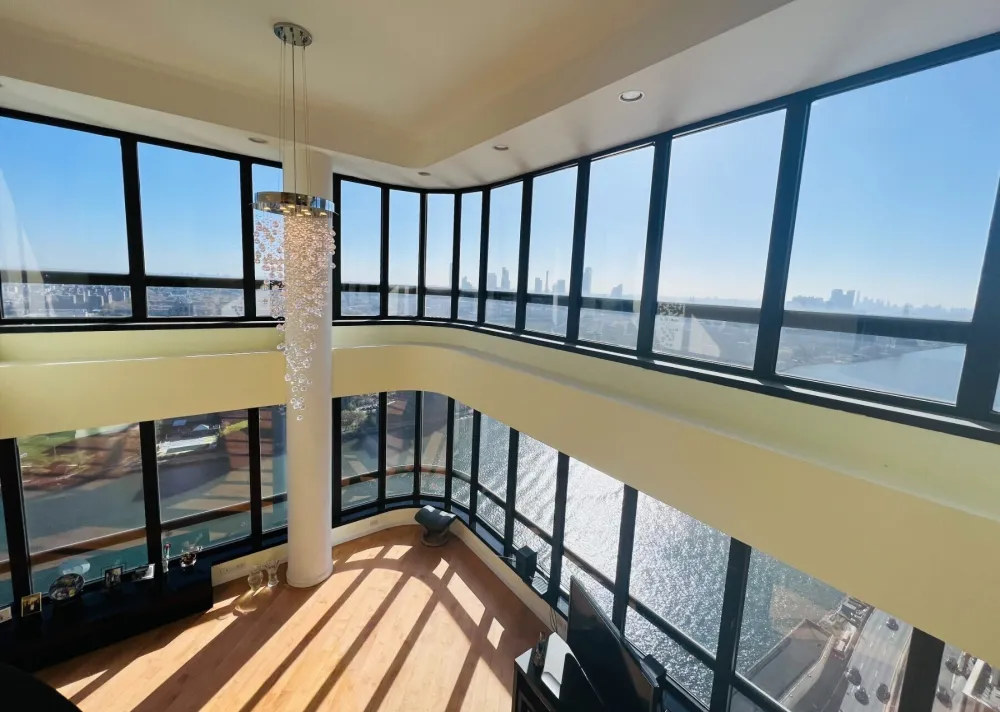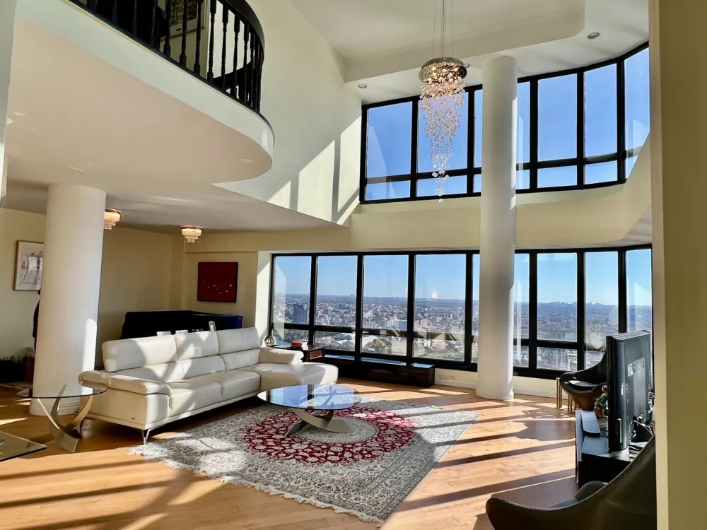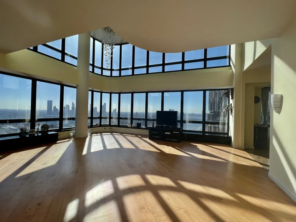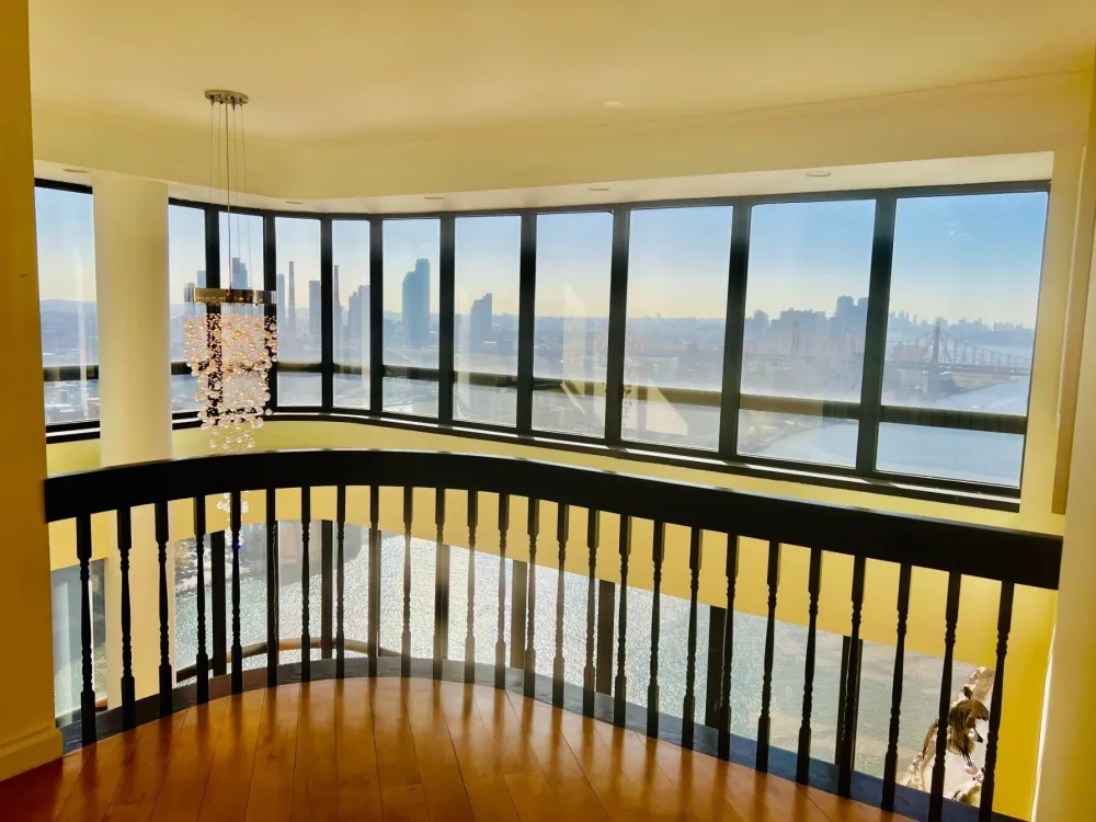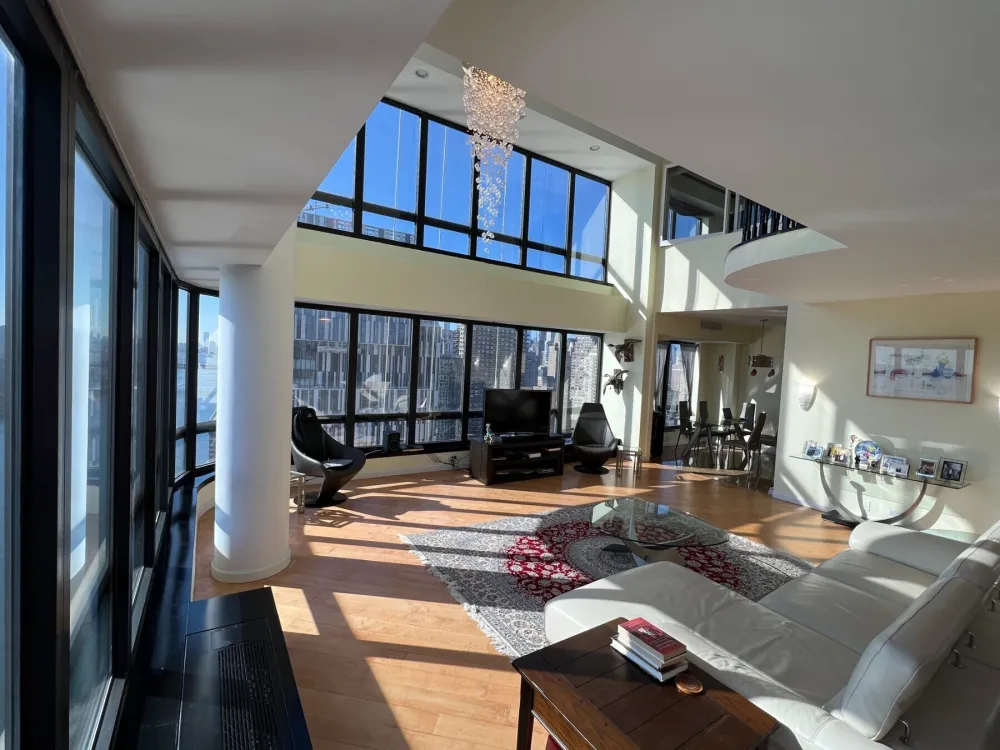 Dream sky-high Duplex Penthouse in the building's coveted 'H' line with stunning river views, three bedrooms and three and a half marble bathrooms. Double height 19 feet high ceilings and windows in the living area with a panoramic South and East view of the East River and Roosevelt Island. Oversize master bedroom with two cedar walk-in closets, huge en-suite master bathroom with his and her sinks, huge Jacuzzi tub and separate shower stall. New wide plank wood floors and renovated eat-in kitchen with stainless steel Wolf appliances, Subzero fridge and Bosch dishwasher, Washer/Dryer. The best corner apartment on top of the building with double exposures, the only Penthouse in the building facing South and East with wrap around floor to ceiling windows. It is a luxurious full-service waterfront Condominium with 24 hour concierge, garage, valet, doormen, porters, handymen, live-in superintendent, children's playroom, roof garden, roof top jogging track, roof top business/conference center with wet bar, storage rooms, maid and dry cleaning services, bicycle room and a very big Residents' Lounge on the top floor (with its stunning river views and its own kitchen & bathroom) that is available for residents' private parties. Common charges include your use of the brand new fully renovated State-of-the-art Fitness Centre, Pilates & Yoga Studio, and a gym offering fitness & meditation classes, locker rooms, sauna, steam rooms, massage room, meditation room, cable TV, top floor heated swimming pool and spa tubs with views galore of the East Side of Manhattan. Steps away from John Jay Park.