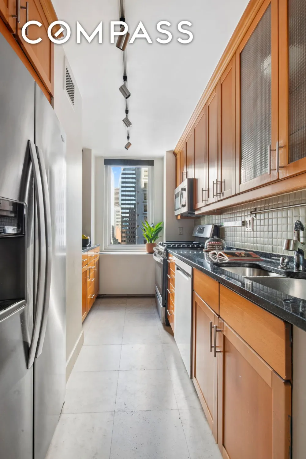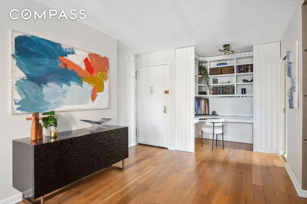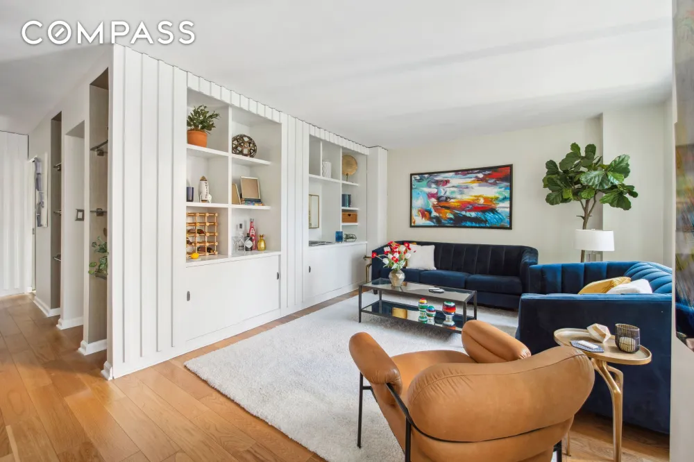 The expansive layout features a gracious open-concept living and dining area with north-facing light, custom built-ins, and honey oak engineered wood flooring. The windowed kitchen—a rarity in Manhattan co-ops—faces west and includes Bosch and GE appliances, a water-and-ice dispensing refrigerator, and generous cabinetry.