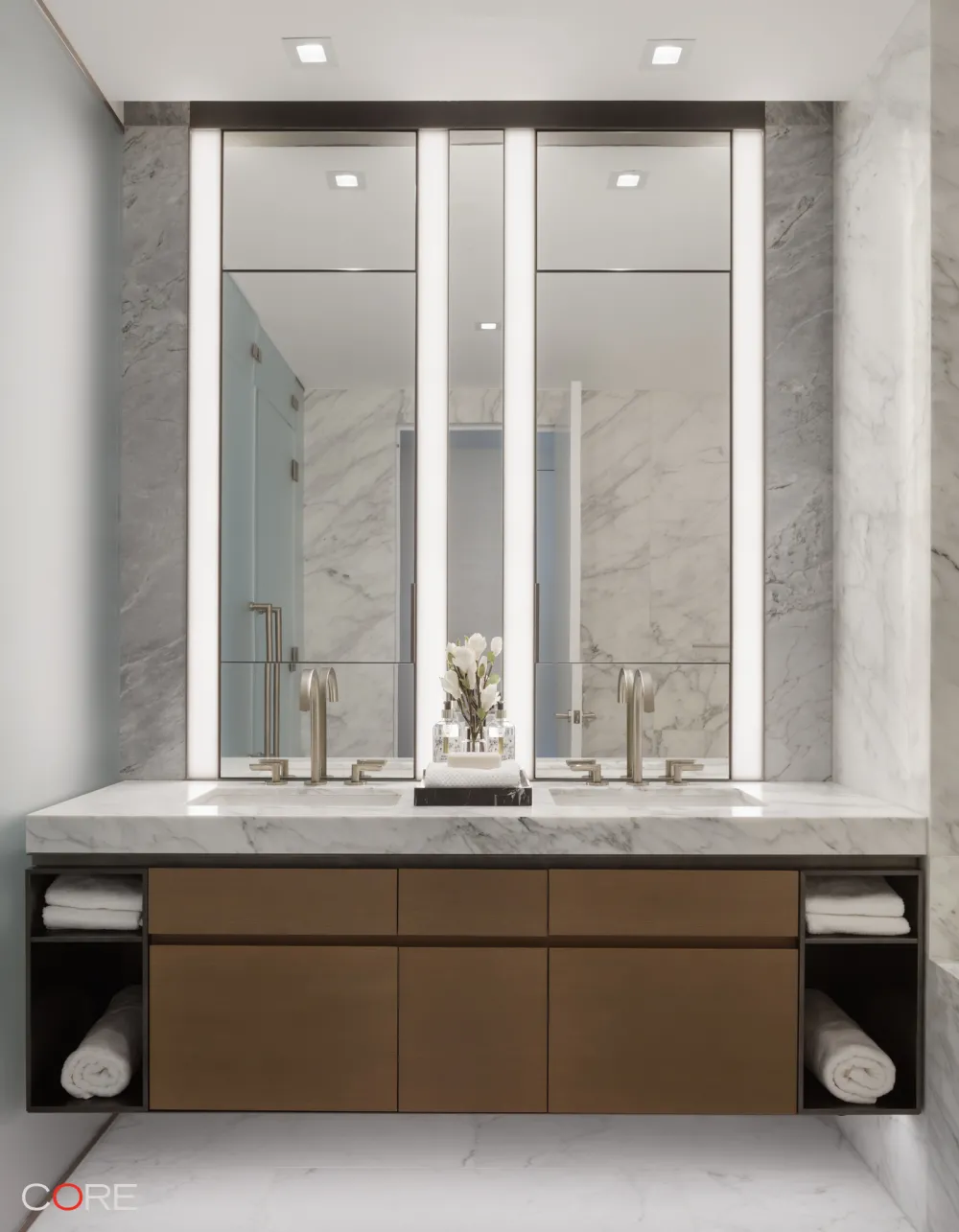 Residence 4CW is 2,108 SF with three bedrooms and three-and-a-half bathrooms. The expansive, open-plan living and dining areas feature west and north exposures, a 21-foot corner great room, a windowed kitchen with a custom Olson Kundig-designed Jackbox, warm wood flooring, and floor-to-ceiling windows.