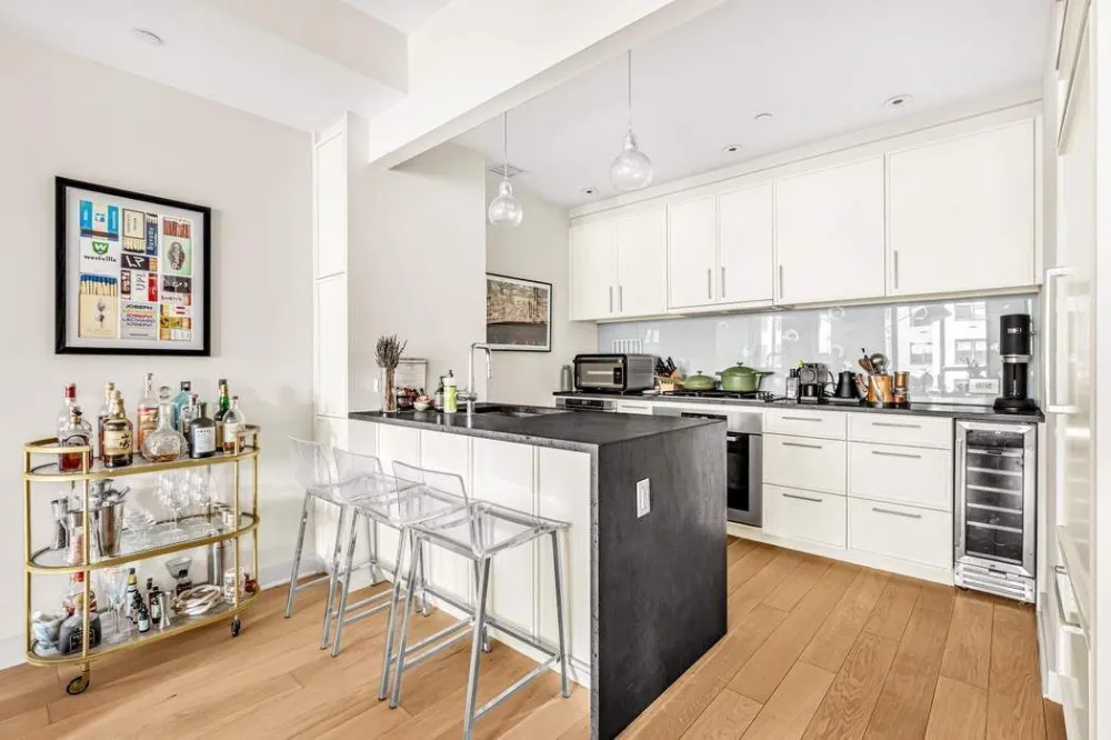 10D is flooded with sunlight from the eastern exposure. The custom kitchen features white cabinetry, top-of-line appliances including fully paneled Sub-Zero refrigerator, Miele dishwasher, a stainless steel Miele range, stone countertops, an island with a waterfall edge, a wine cooler, and an under-mount... See more