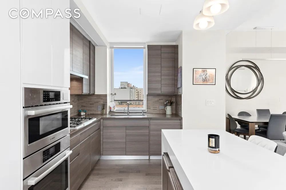 The state-of-the-art kitchen is a culinary masterpiece, featuring sleek Italian cabinetry, a substantial quartz center island with abundant storage, and top-of-the-line appliances, including a custom-paneled Sub-Zero refrigerator and freezer, a Bosch five-burner gas cooktop with a vented hood, a separate oven, and a Bosch dishwasher.