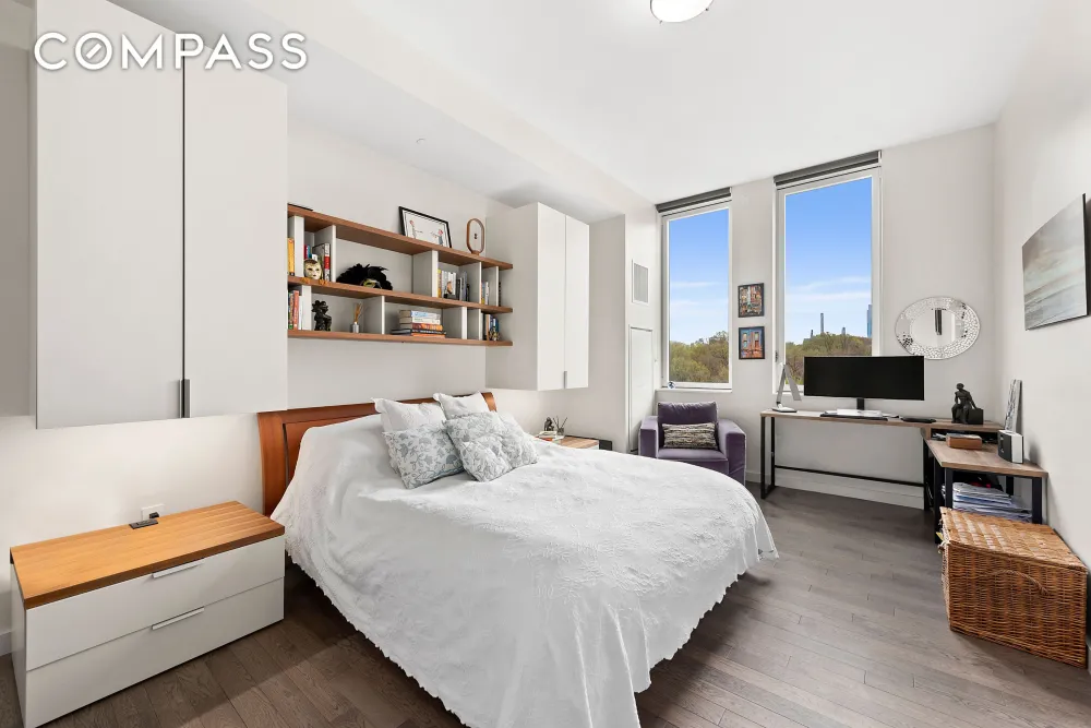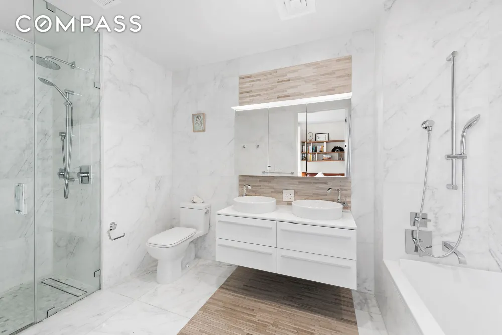 Positioned near the entrance, a spacious north-facing bedroom (10’ x 12’8”) boasts a large custom-built closet and access to a windowed full bathroom which also doubles as a guest powder room. The primary suite, set apart for privacy, showcases stunning southern views of Central Park, a custom-designed walk-in closet, and an indulgent en-suite bath outfitted with radiant heated floors, a deep soaking tub, a spa-like glass-enclosed shower, and a dual-sink vanity. The 3rd and 4th bedrooms in this wing feature expansive open northern exposures, ample closet space, and custom built-ins.