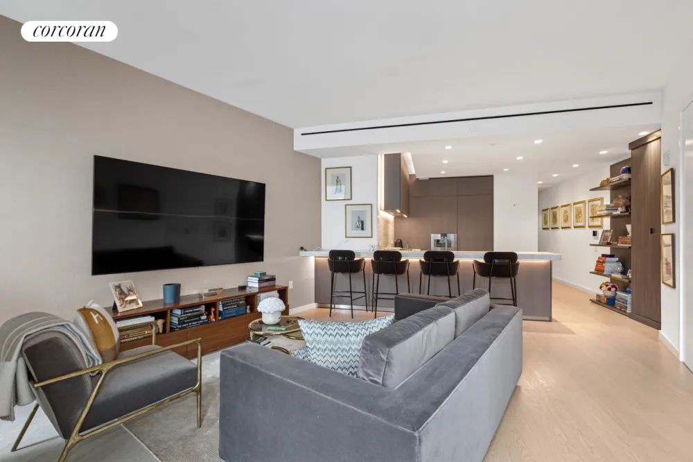 The sophisticated customization of the apartment includes custom built-ins for additional storage, a custom shoe closet, thoughtfully designed high-end closets, and additional cabinets and shelving in the powder room and the laundry area. The Lutron lighting system has been upgraded for a more user-friendly experience, and customized window treatments have been installed throughout the apartment. There is also premium wallpaper in the living room and bedroom, adding a luxurious and elegant touch.