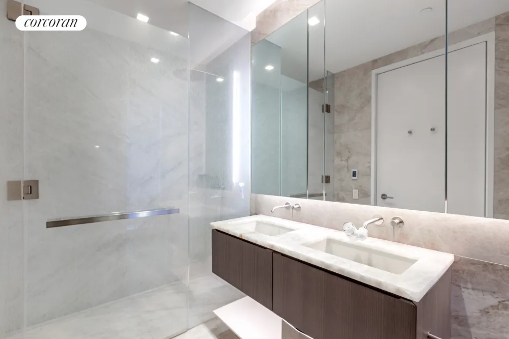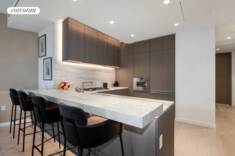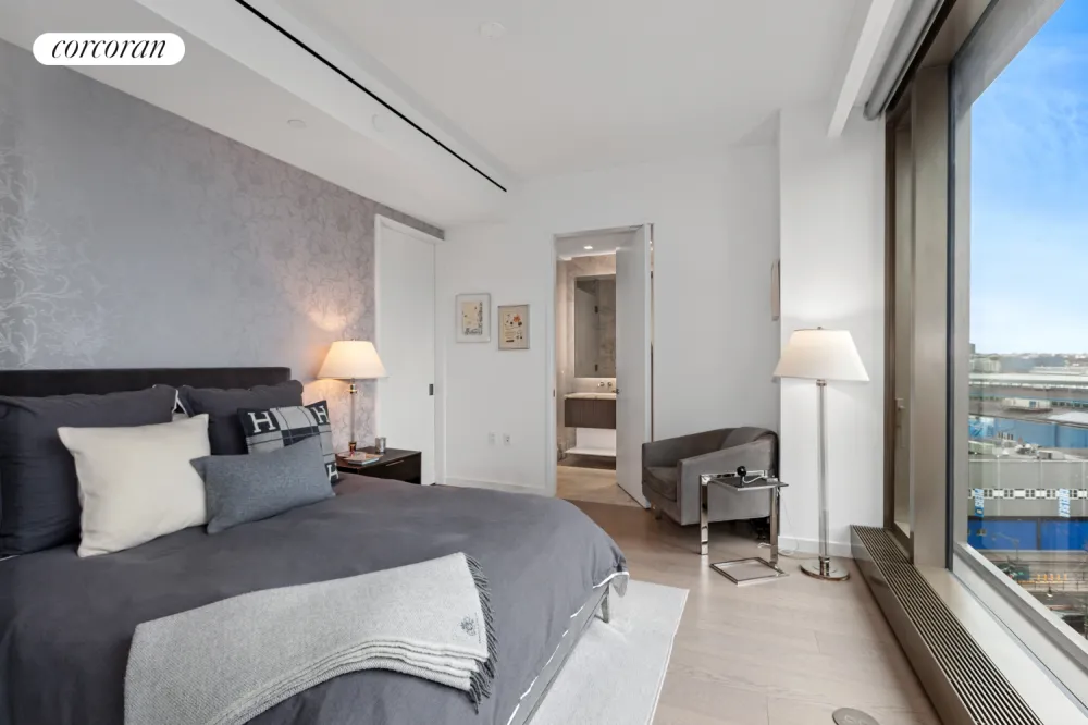 One of the first resales at One High Line! West 9D has been beautifully customized to the highest standards by the current owner and is truly move-in condition. This bright 959 SF 1 bed, 1 bath residence boasts a generous living/dining room and open chef's kitchen complete with quartzite countertops and backsplash, Gaggenau appliances, fantastic storage and counter space and a large breakfast bar. The primary suite welcomes natural light throughout the day and the elegant ensuite bath is clad in quartzite and has radiant heat flooring, custom double-sinks, integrated illuminated medicine cabinet, and etched glass shower doors. There are floor-to-ceiling windows throughout the apartment with open city views and even a glimpse of the river! The apartment also includes a powder room, ample storage, a washer-dryer, and a state-of-the-art home automation system by Kraus Hi-Tech.