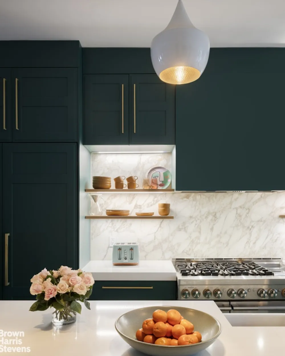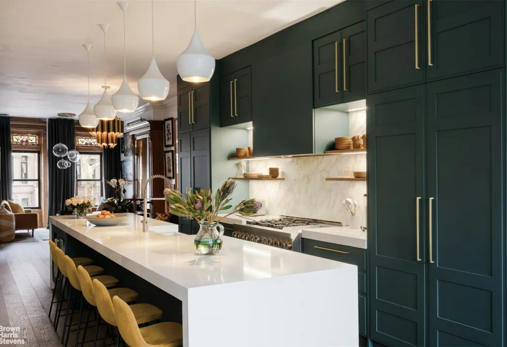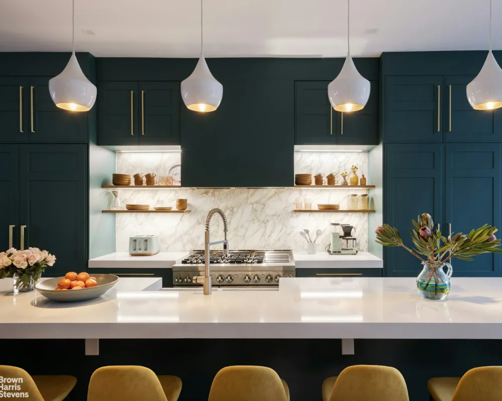 Bespoke kitchen: Custom-designed in Italy, featuring Jenn-Air appliances, a marble backsplash, and quartz countertops
