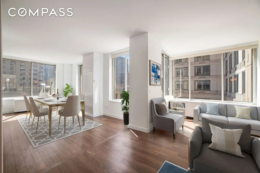 Step inside to discover a light-filled oasis, where oversized windows offer breathtaking city views with eastern and southeastern exposures. The open floor plan is accentuated by rich hardwood floors and sophisticated recessed lighting, creating an inviting ambiance throughout.
