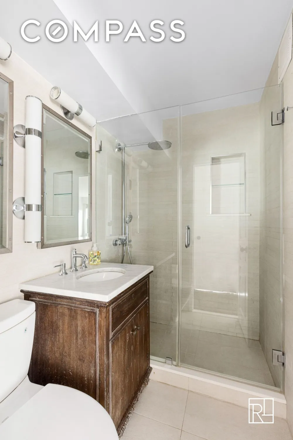 The spa-like bathroom is wrapped in Italian marble and finished with Restoration Hardware fixtures, including dual rain showers with an overhead and matching hand shower, Hansgrohe fixtures, and dual mirrored medicine cabinets for ample storage. A hidden linen closet adds even more convenience.