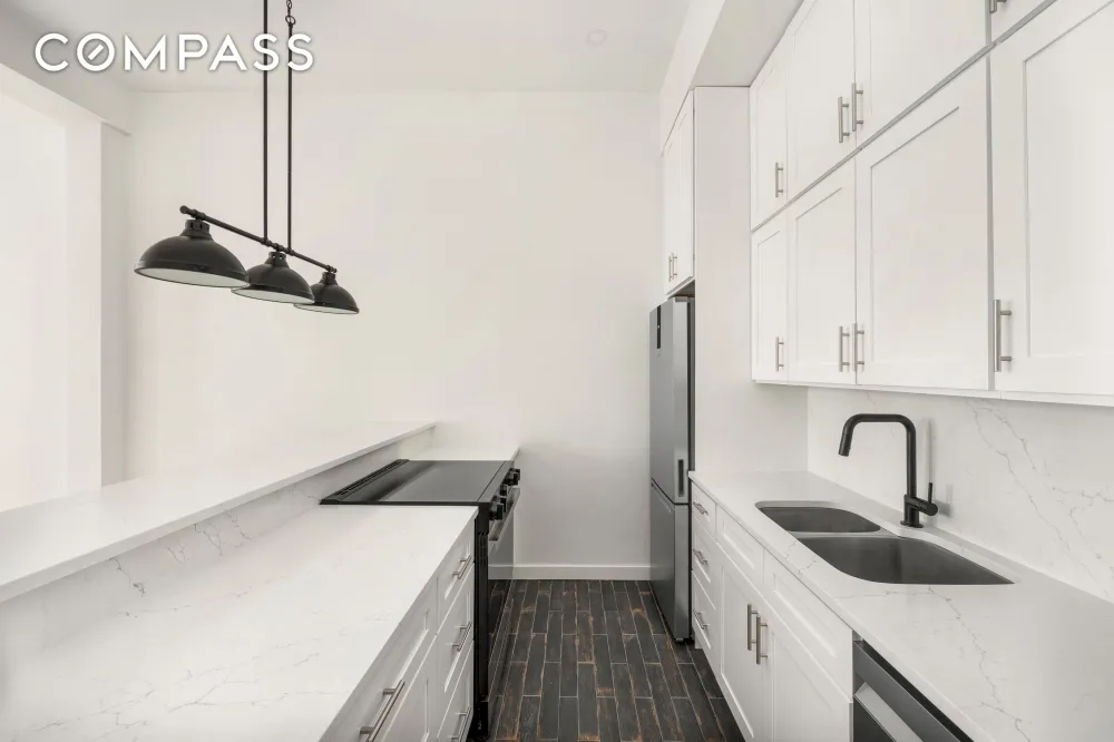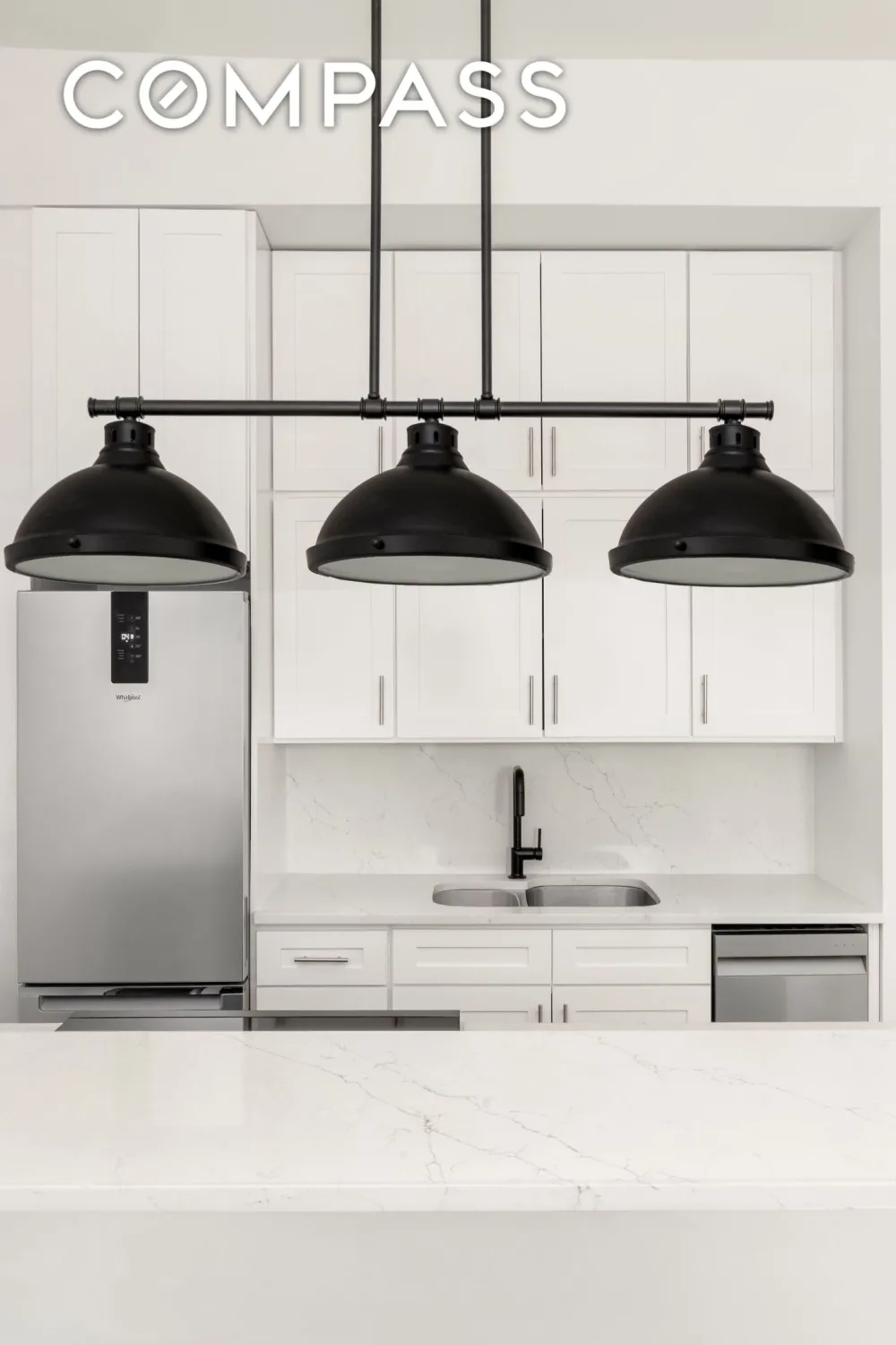 During construction, the original galley kitchen was redesigned into an open-concept, seamlessly integrated with the living area. A large breakfast bar, comfortably seating four, now serves as its centerpiece. With meticulous attention to detail, the kitchen is elegantly finished with marbled quartz countertops and a full-height slab backsplash, abundant shaker-style cabinetry, a Ruvati double basin sink and premium fixtures, including a matte black Brizo pull-down faucet. Brand-new stainless steel appliances — a dishwasher and "smart" range from Samsung (with air fryer and sous vide modes) — and a 25-bottle wine cooler complete this culinary space.