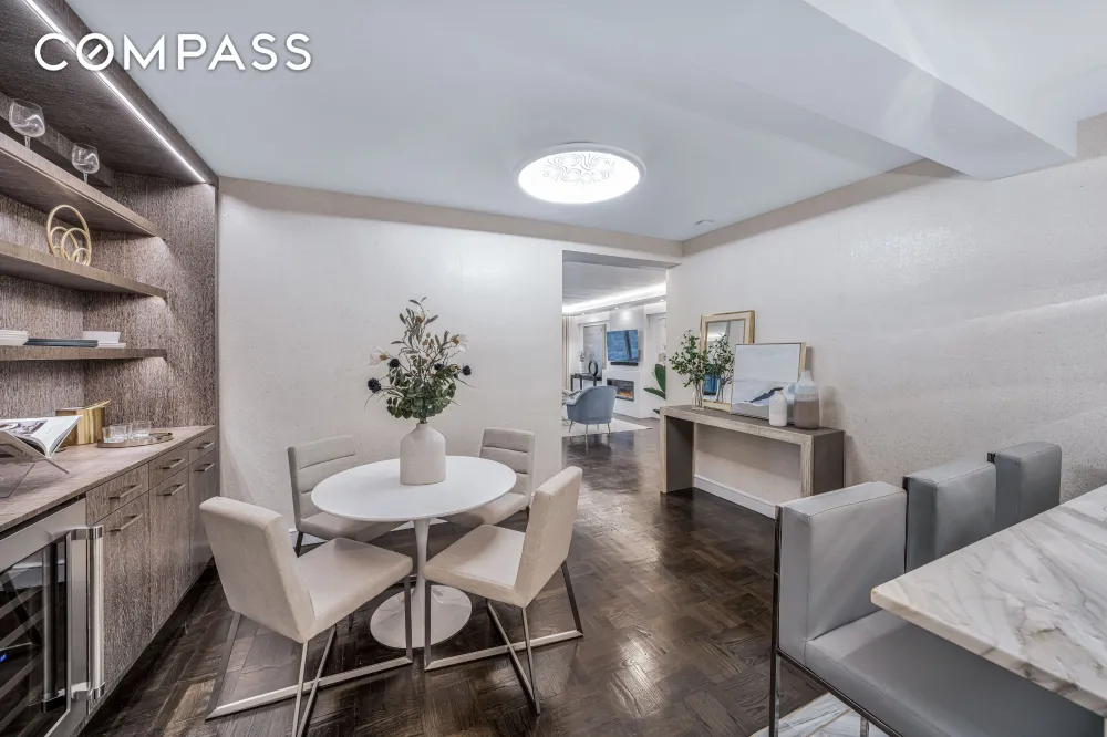 This apartment’s comprehensive renovation also includes brand-new windows, updated electrical wiring, new HVAC systems with individual digital thermostats, and Lutron motorized shades that offer both style and functionality. The dining area and main bedroom are adorned with sophisticated wallpaper, adding an extra touch of elegance.