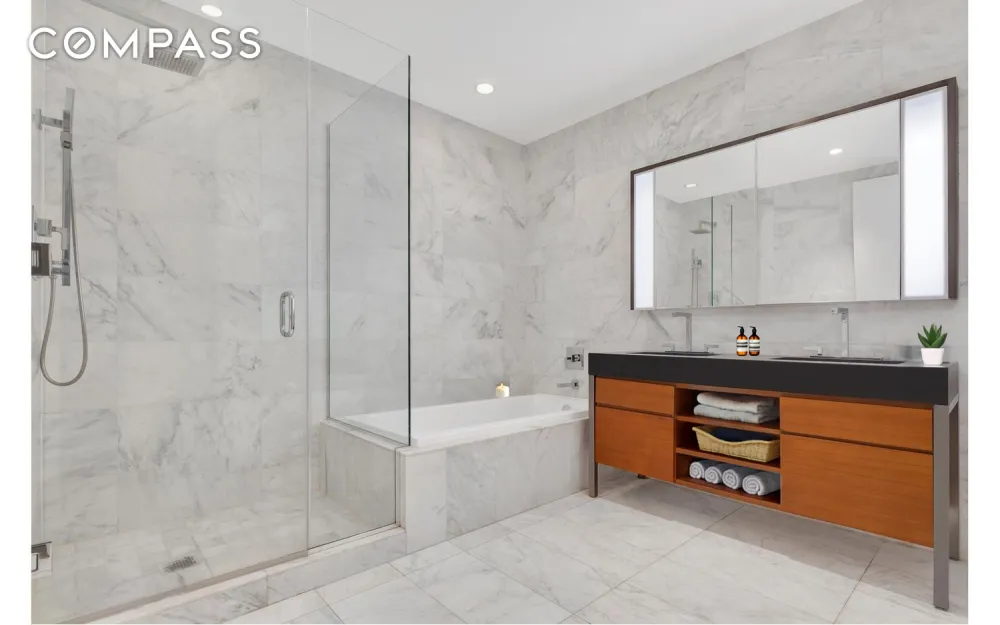 The second bedroom, equally spacious and quiet, offers iconic western views over the landmarked Cocoa Exchange building, while the guest bathroom is a work of art in itself, featuring a custom wood vanity, marble countertops, and a deep soaking tub.