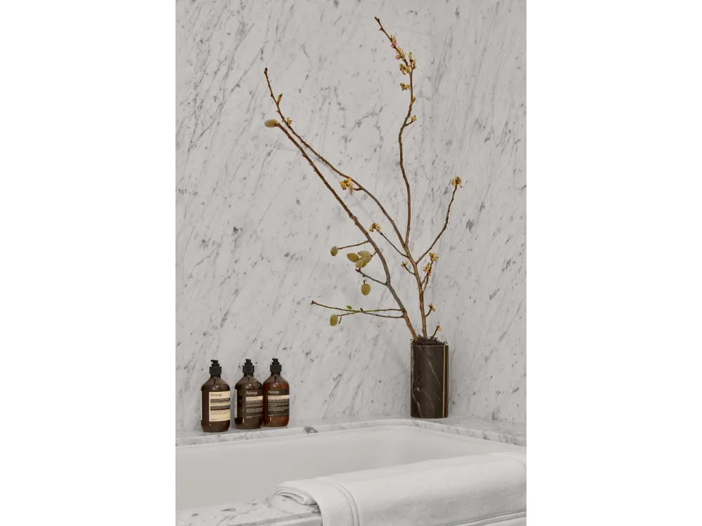 The elegant primary bathroom features floor-to-ceiling honed white Bianca Carrara marble slab walls and radiant heated custom designed mosaic marble tile floor. A custom vanity with polished Luna Gray marble countertop, elegant stainless-steel legs, and integrated lighting provides exceptional storage complementing a double medicine cabinet with integrated lighting, mirrors, and concealed electric outlets. The bath-tub shower features fixtures and fittings custom forged in polished nickel exclusively for Waldorf Astoria Residences.
