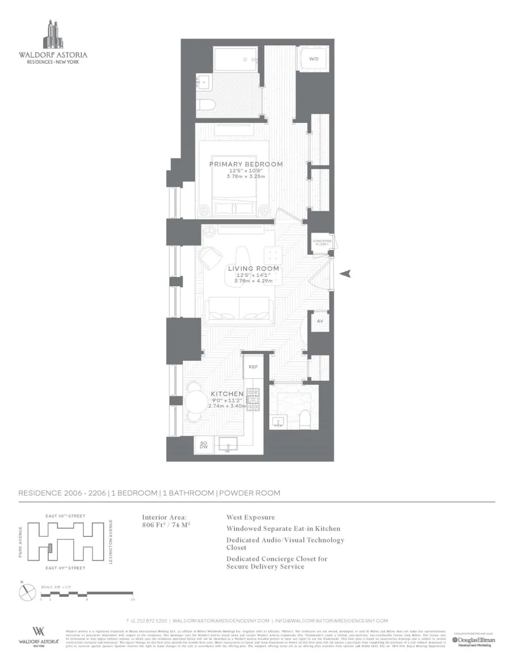 Own a piece of the legacy at Waldorf Astoria Residences New York. Residence 2006, 806 SF one-bedroom, one-and-a-half-bath home offering a windowed eat-in kitchen with western exposure. Designed by internationally acclaimed designer Jean-Louis Deniot, residences combine modern comfort with signature features such as a dedicated Concierge Closet and keyless entry with opulent details like ceiling coves, herringbone floors, oversized custom-paneled doors and grand entry foyers with marble floors and brass inlays.