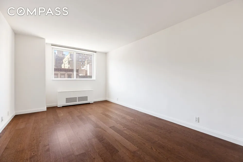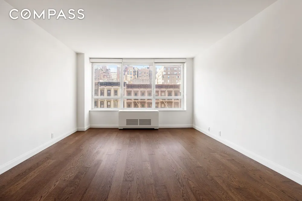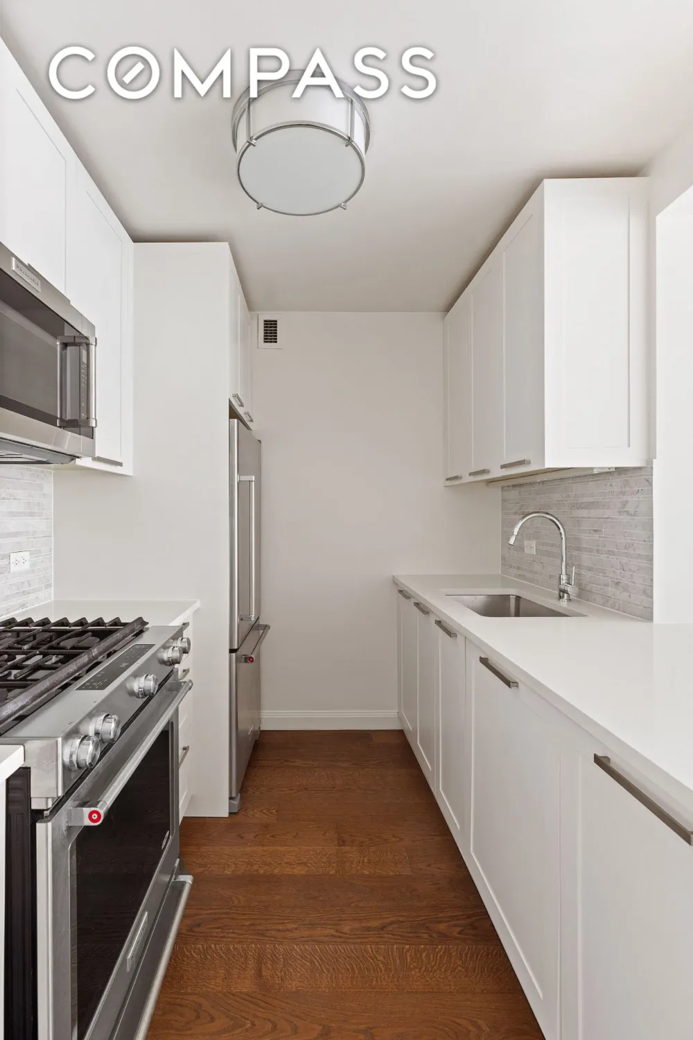 Expansive windows invite abundant natural light while offering charming treetop views. Thoughtfully designed, this residence features rich oak hardwood flooring, a dedicated dining area, generous closet space, and a washer/dryer hookup. The pass-through kitchen boasts sleek Caesarstone countertops, custom cabinetry, and premium stainless steel appliances, while the newly renovated bathroom adds a refined, contemporary touch.